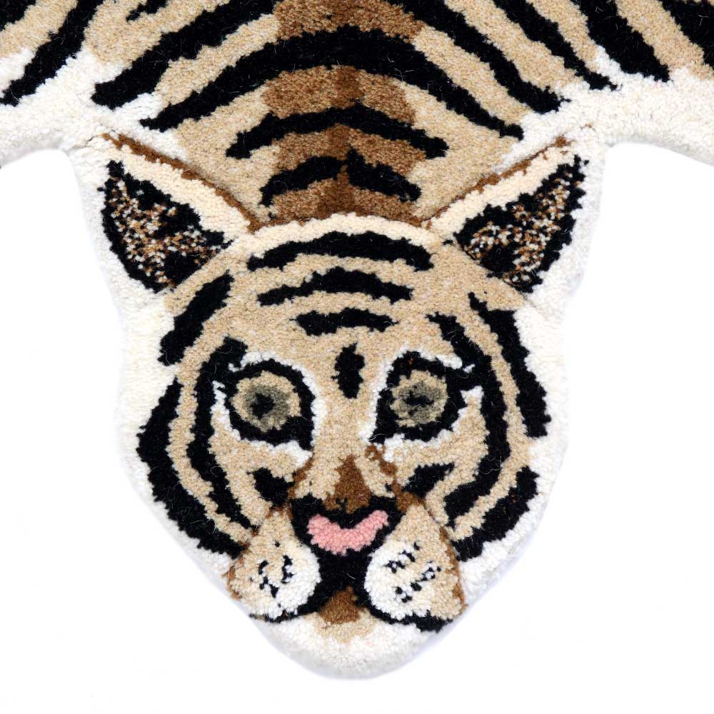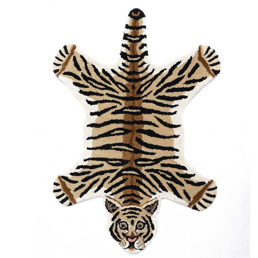 This exquisitely crafted Drowsy Tiger Rug Small will brighten up any space. Handmade in India, this 100% wool rug has a cotton backing. Place this elegant and sophisticated carpet in your living room and bedroom and prepare to receive numerous compliments from your guests. Not perfect, but definitely one-of-a-kind! This handcrafted rug depicts a tiger lying flat on its back, with its spine traceable from beneath its head to the tail. This one is one-of-a-kind and distinctly Indian, and it would make a quirky addition to your space.