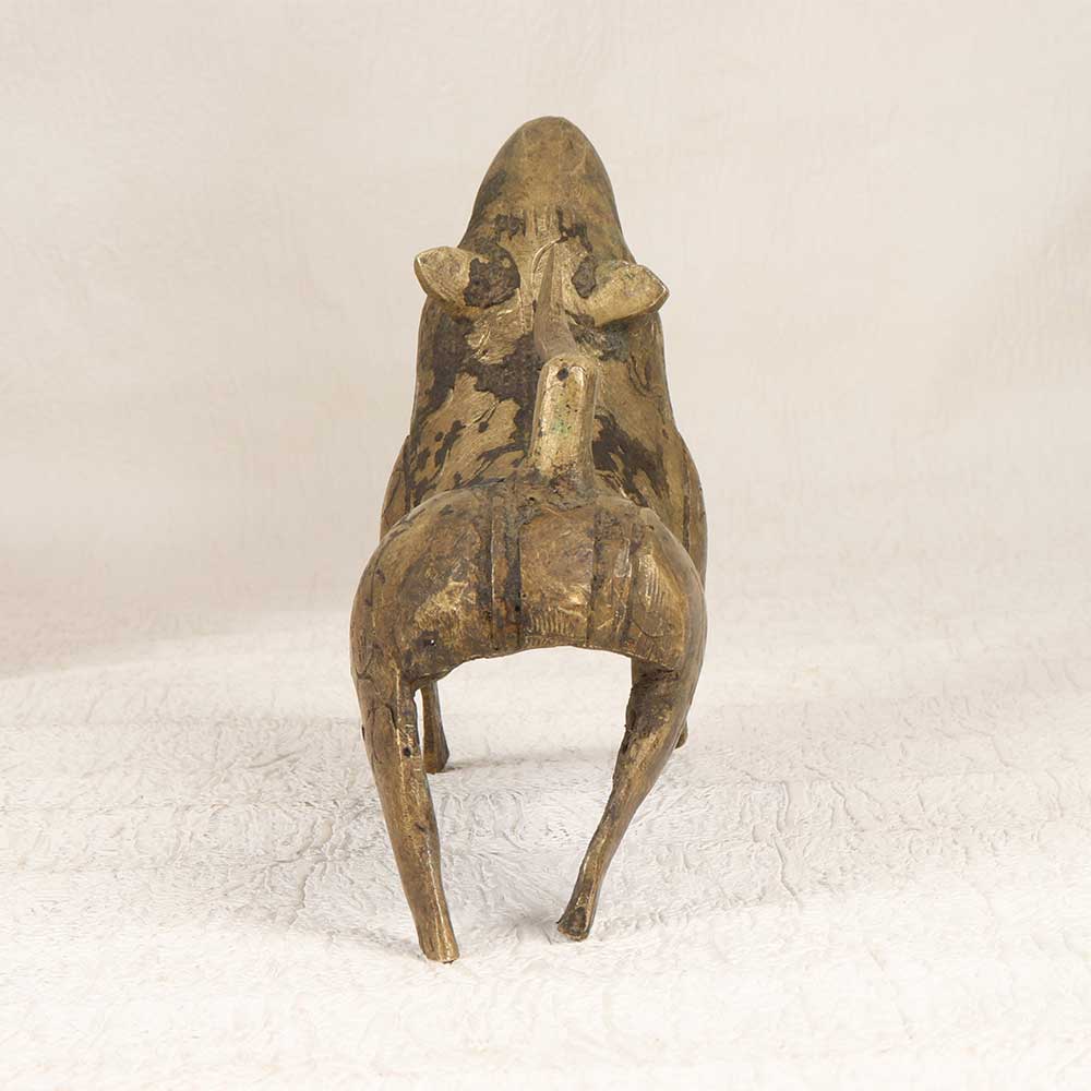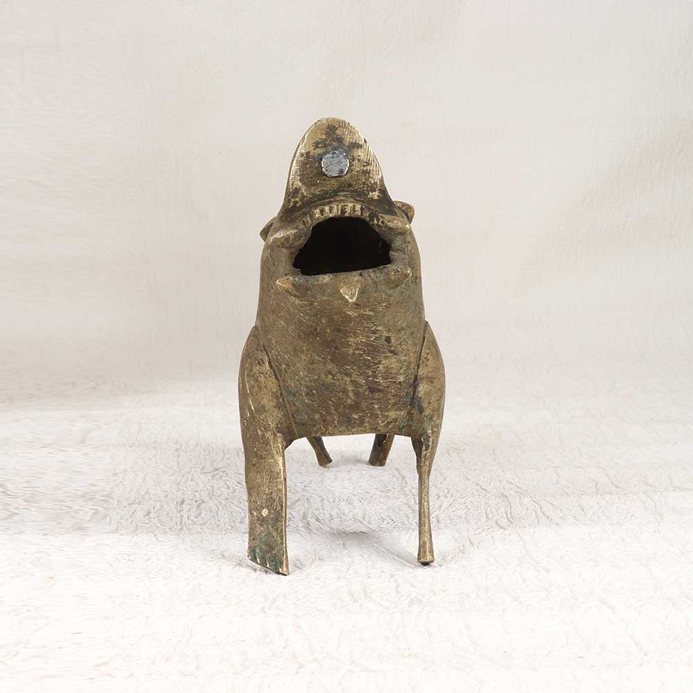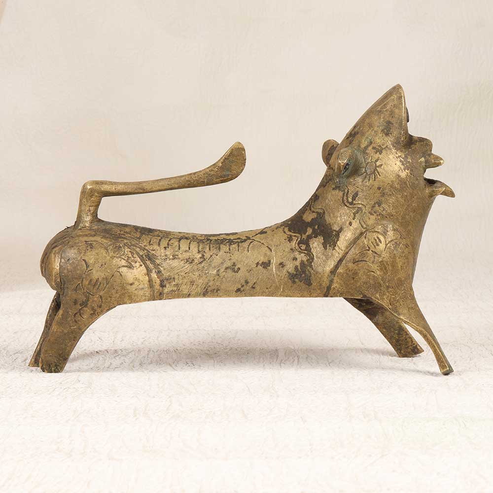 Let out a mighty roar with this spectacular vintage brass lion statue, handcrafted in Eastern India. This museum-quality sculpture depicts the king of beasts in all his glory, mouth open wide in a ferocious roar that commands attention. This antique treasure brings the thrill of the wild right into your living space. The exquisite craftsmanship is evident at a glance, from the textured mane to the rippling muscles and regal stance. Place this lion on guard to impart strength, courage and uncompromising confidence. For lovers of exotic decor and wildlife, this vintage Eastern Indian lion sculpture is simply magnificent. A breathtaking addition to any interior that will become an instant conversation piece.