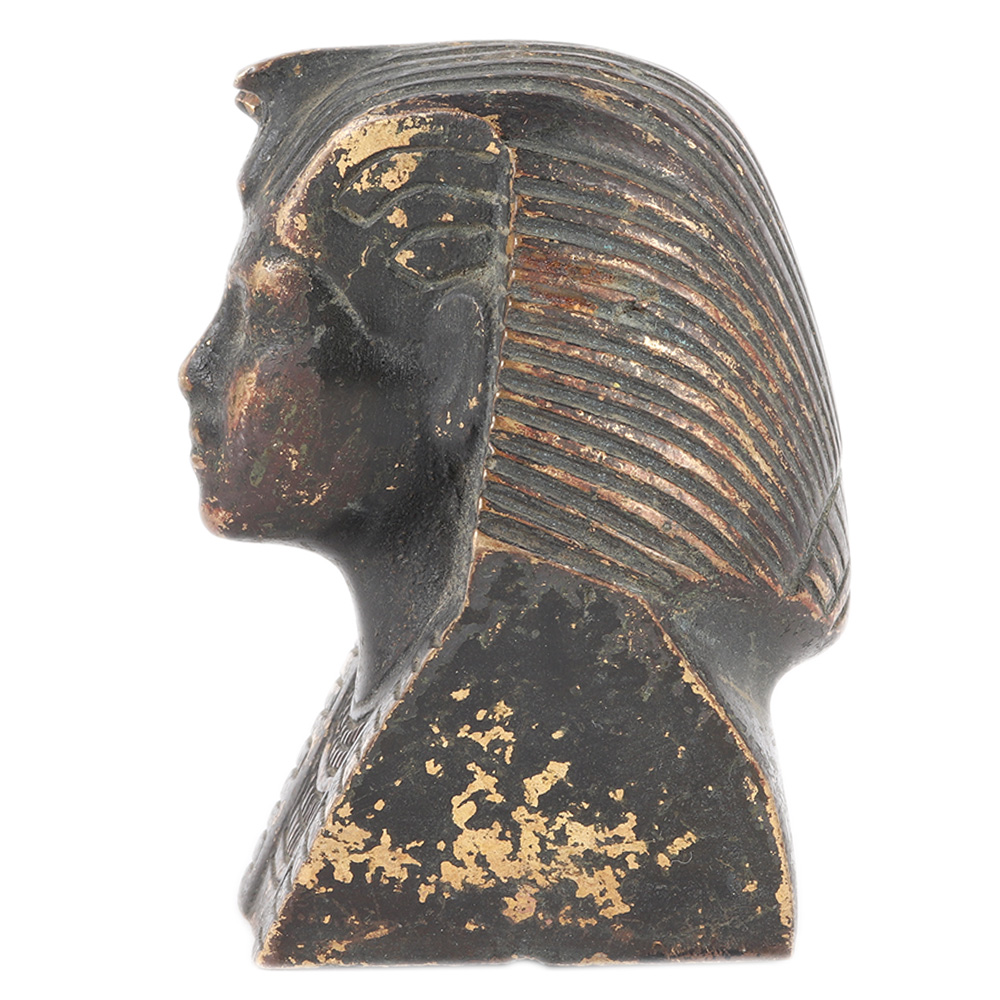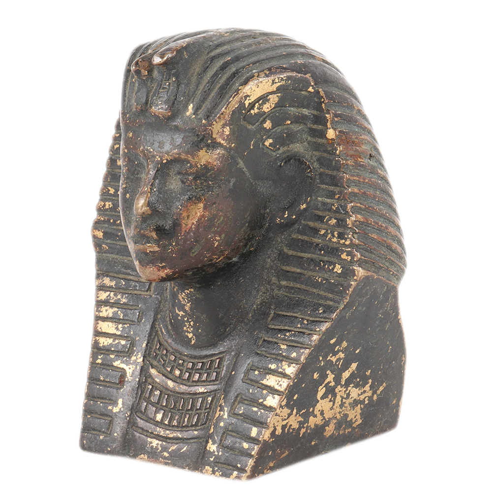 With this brass bust of King Tut figure, you can relive one of Egypt's most celebrated and powerful dynasties. King Tut, adorned in his golden mask, sits in his coffin tomb beneath the protection of a pyramid. This figure was expertly carved to depict this ancient king.