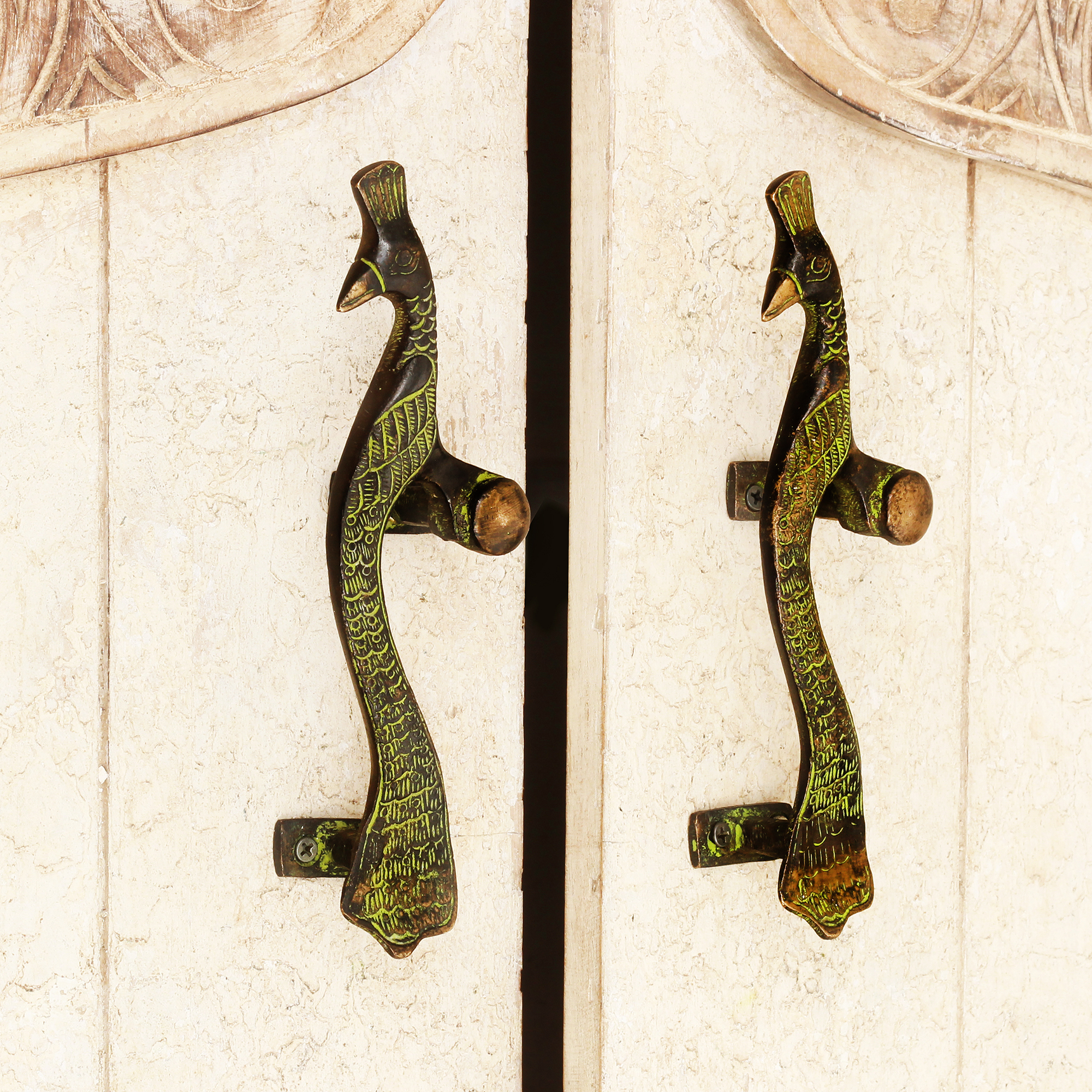 Transform plain looking wooden door into something artistic and extraordinary. This beautiful brass peacock on the either side with their body flair joining together for a large wing like appearance. Comes with a lovely green patina.