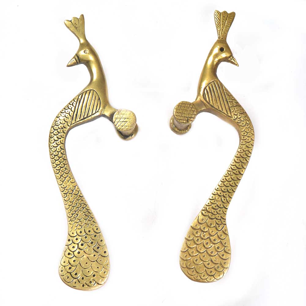 Transform plain looking wooden door into somethig artistic and extraordinary. This beautiful brass peacock on the either side with their body flair joining together for a large wing like appearance.