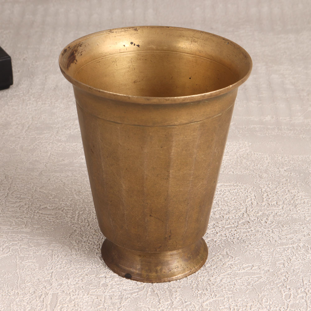 This Vintage Brass Holy Water Glass in an antique brown finish is a true masterpiece crafted by highly Indian artisans in the timeless tradition of South Indian artistry. Meticulously handmade from high-quality brass, this sacred vessel is a symbol of devotion and craftsmanship. This Holy Water Glass is not just a religious artefact but also a work of art that adds a touch of elegance to any sacred space. It serves a multitude of purposes – perfect for holding holy water during prayers, havans, or rituals. Its rich, antique brown finish adds an aura of antiquity and reverence. Versatile in its use, this holy water glass can grace your home, office, restaurant, hotel, or cafe's prayer room, enriching the atmosphere with a divine ambiance. Additionally, it can be employed as a decorative piece, adorned with fresh flowers, enhancing your space's aesthetics. Surprise your family, friends or relatives with this meaningful gift on special, festive, or auspicious occasions, symbolizing your best wishes and reverence. This Vintage Brass Holy Water Glass encapsulates tradition, artistry, and spirituality in a timeless and elegant form.
