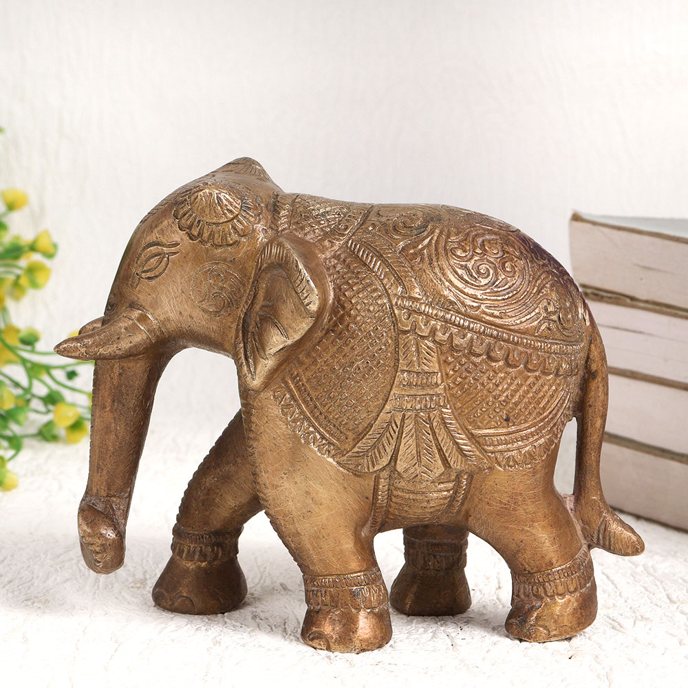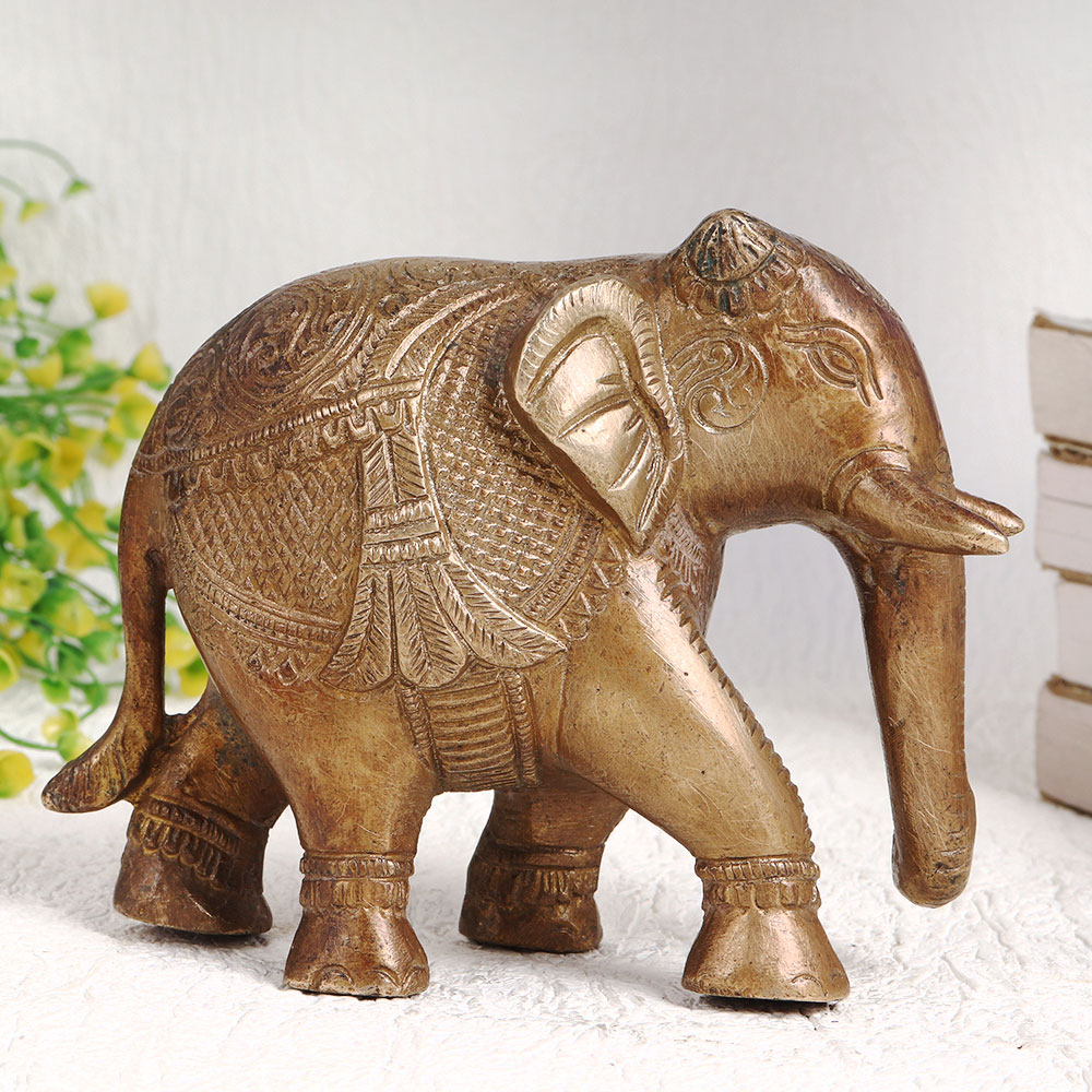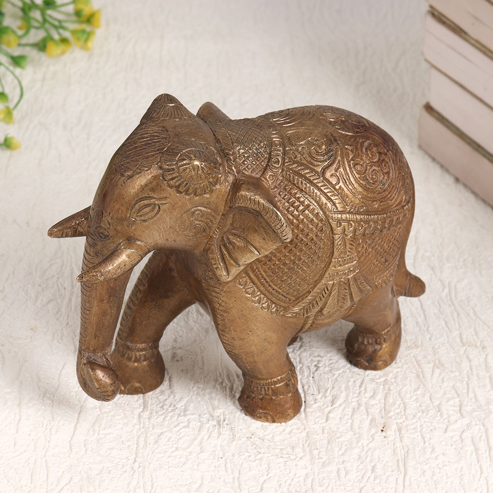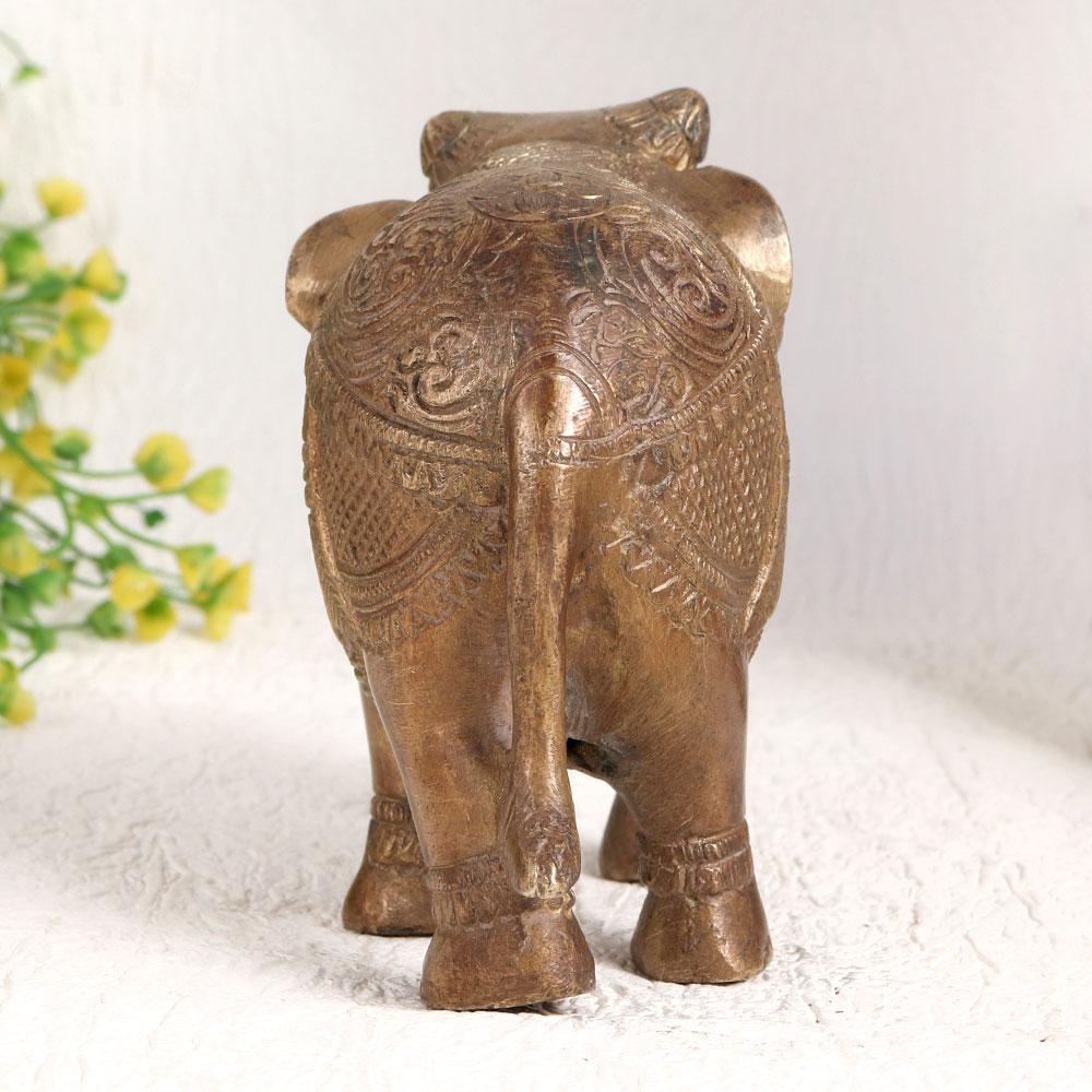 Adorn your interior with the timeless charm of our exquisite brass elephant statue in an antique brown finish. Meticulously crafted by skilled Indian artisans, this masterpiece showcases their dedication to perfection and their profound understanding of traditional craftsmanship. Made from high-quality brass, this statue not only embodies elegance but also promises longevity. This versatile piece seamlessly blends with various settings, making it a remarkable addition to your home, office, restaurant, hotel, cafe, or shop. Its captivating design can effortlessly transform any space into a captivating oasis of culture and sophistication. Whether you're an avid collector of vintage treasures or curating an exhibition, this brass elephant statue is a must-have. Its intricate details and rich, antique brown patina make it a captivating centerpiece. Additionally, this statue serves as an ideal gift for your family, friends or relatives on special, festive, or auspicious occasions, symbolizing strength, wisdom, and good fortune. Embrace the spirit of Indian artistry and heritage with this exceptional brass elephant statue, a testament to both timeless craftsmanship and elegant aesthetics.
