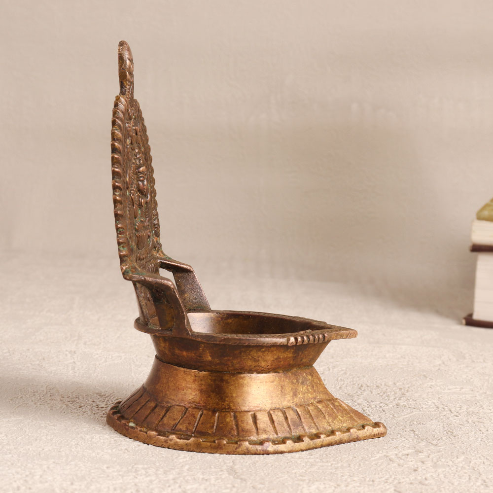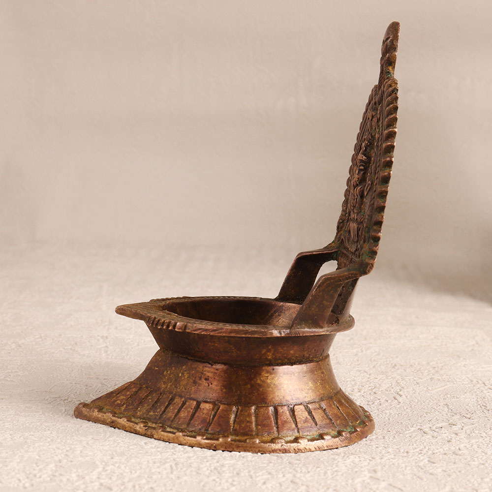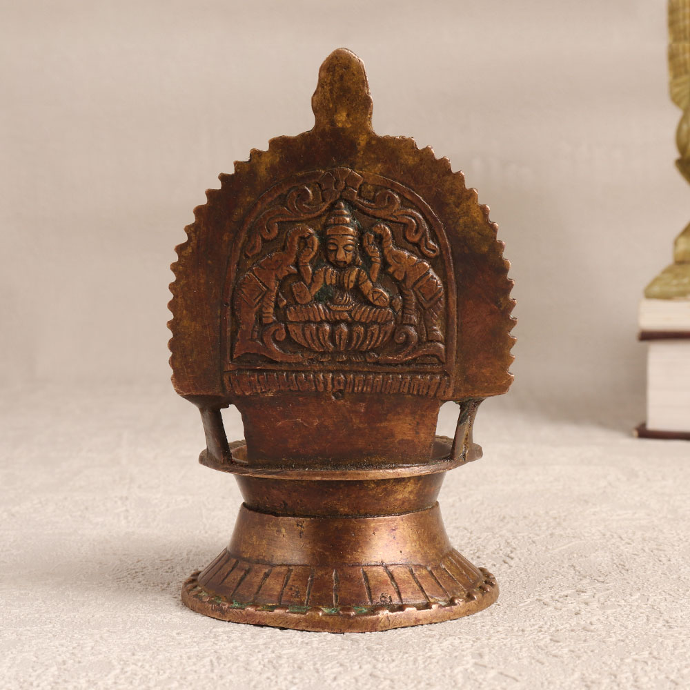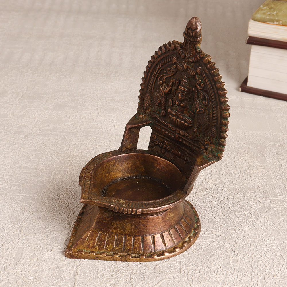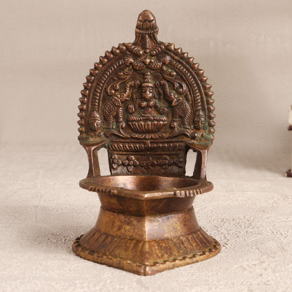 A Vintage Brass Gajlakshmi Oil Lamp which is a timeless piece that echoes the rich cultural heritage of India. Also known as the Gajlaxmi oil lamp, this exquisite creation is a manifestation of divine grace. Crafted by highly skilled Indian artisans, the lamp features an antique brown finish that adds an aura of sophistication to any space. Handmade from high-quality brass, this lamp is not just a symbol of traditional elegance but a functional item for spiritual rituals. It can be ignited using mustard oil or ghee with a cotton wick, creating a warm and serene ambiance perfect for prayer. Its versatile design allows it to seamlessly adorn homes, offices, restaurants, hotels, or cafes, especially in prayer rooms. This vintage masterpiece is not only a valuable addition to your antique collection but also a thoughtful gift for your family, friends or relatives on special, festive, or auspicious occasions. Illuminate your surroundings with the divine glow of the Gajlakshmi Oil Lamp, a tribute to craftsmanship and spirituality.