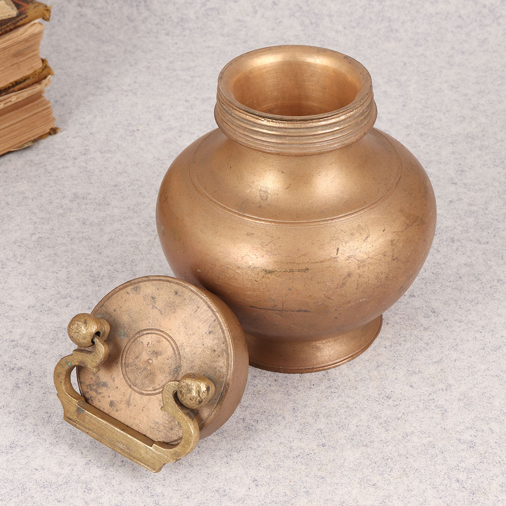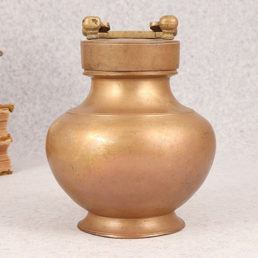 Buy a Vintage Brass Gangajali Pot online that is a timeless piece crafted by skilled Indian artisans with a rich tradition of artistry. This exquisite pot, with its lid and a gracefully designed handle, is an embodiment of cultural heritage and spirituality. Made from high-quality brass, the pot showcases a distinguished antique brown finish that adds an air of authenticity. This Gangajali Pot holds deep significance in rituals and is commonly seen in temples, making it a sacred addition to any prayer room. Its versatility extends beyond religious settings, as it seamlessly complements the ambiance of homes, offices, restaurants, hotels, or cafes. The handmade craftsmanship adds a unique touch, making each piece a work of art. Embrace the nostalgia and elegance of the past by incorporating this pot into your vintage collection. Its aesthetic charm makes it an ideal decor item, effortlessly blending tradition with contemporary spaces. Moreover, this pot makes for a thoughtful and meaningful gift for your family, friends or relatives during special, festive, or auspicious occasions, symbolizing blessings and goodwill. Enhance your surroundings with the grace and heritage embodied in the Vintage Brass Gangajali Pot.
