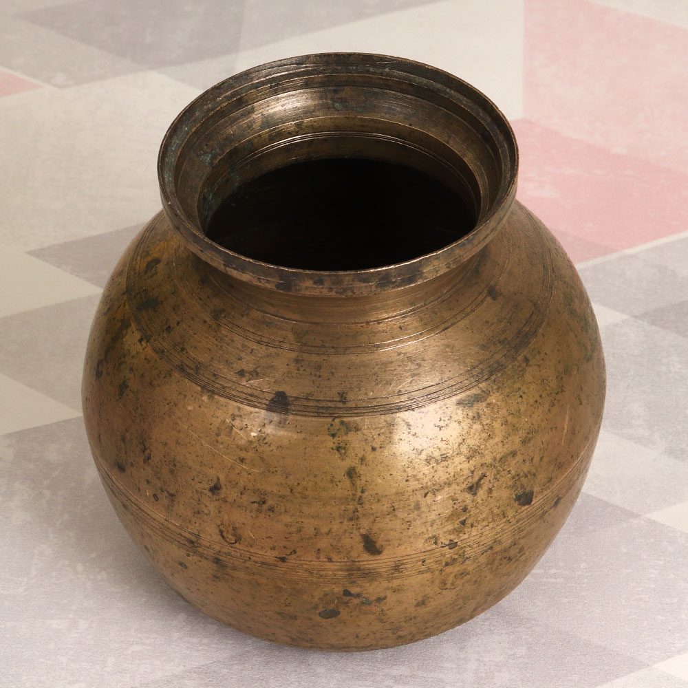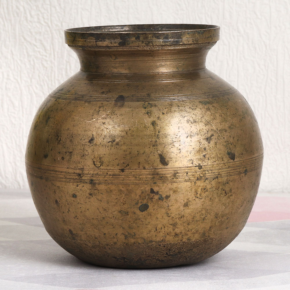 Buy a Vintage Brass Holy Water Pot online that is a masterpiece meticulously handcrafted by highly skilled Indian artisans in the illustrious South Indian Art tradition. Exuding an antique brown finish, this pot is a testament to exquisite craftsmanship, showcasing the rich heritage of India. Crafted from high-quality brass, this versatile piece seamlessly blends tradition with contemporary aesthetics. Whether adorning your home, office, restaurant, hotel, cafe, or shop, it exudes an aura of elegance and spirituality. As an indoor flower pot, it adds a touch of sophistication and a hint of vintage allure to any setting. Beyond its aesthetic appeal, this brass pot serves a sacred purpose. During havan, rituals, and auspicious occasions, it becomes the vessel of choice to hold holy water, symbolizing purity and sanctity. Additionally, its adaptability allows it to be part of your indoor plant collection, infusing life and greenery into your space. Consider this Vintage Brass Holy Water Pot not only as a valuable addition to your vintage collection but also as a thoughtful gift for your family, friends or relatives on special, festive, or auspicious occasions. Embrace tradition, elegance, and spirituality with this remarkable piece of artistry.