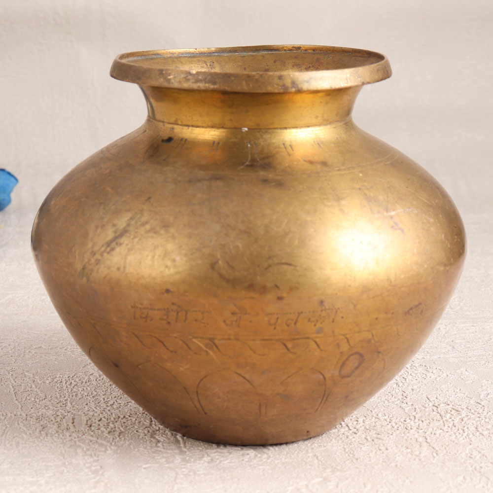 Immerse yourself in the rich cultural heritage of India with this exquisite vintage brass holy water pot. Handcrafted by highly skilled artisans from the heartland of Gujarat, this stunning piece features a distinctive antique brown finish that adds a touch of rustic charm to any space. This holy water pot is meticulously fashioned using high-quality brass, ensuring both its durability and aesthetic appeal. Its versatility is unmatched, making it an ideal addition to your home, office, hotel, cafe, shop, or restaurant's prayer room. Use it during your prayers, and its beauty is equally appreciated as a small flower pot, bringing a sense of tranquillity to your environment. Whether you're a collector of vintage artefacts or looking for a unique decor piece, this holy water pot is a splendid choice. Display it at exhibitions to showcase its historical and artistic significance. The holy water pot also makes for a meaningful and cherished gift for your family, friends or relatives on special, festive, or auspicious occasions, adding a touch of spirituality and elegance to their lives. Embrace tradition and craftsmanship with this exquisite brass piece from Gujarat, India.