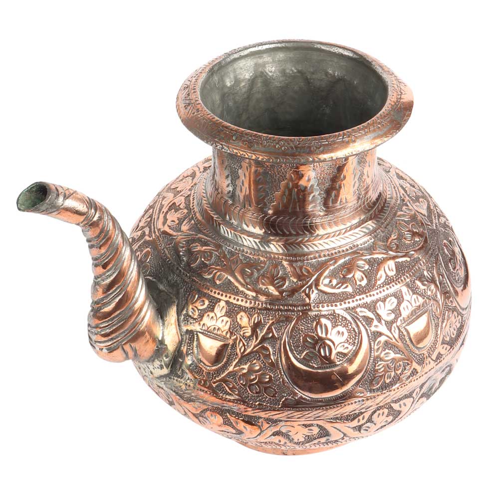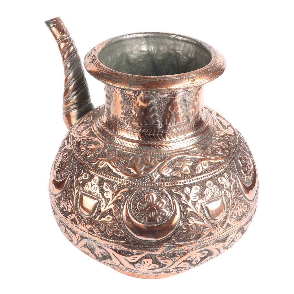 Embossed Floral Design Copper Water Pot With Stout, the design covering almost every area of the pot including the stout, but excepting the foot. The design is similar to indo Persian design with lots of flowers and leaves . Wedding gift, Christmas gift and ideal collectors item.