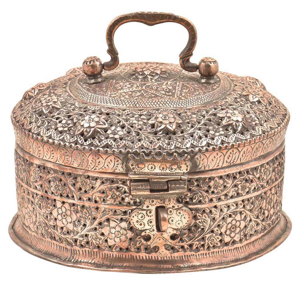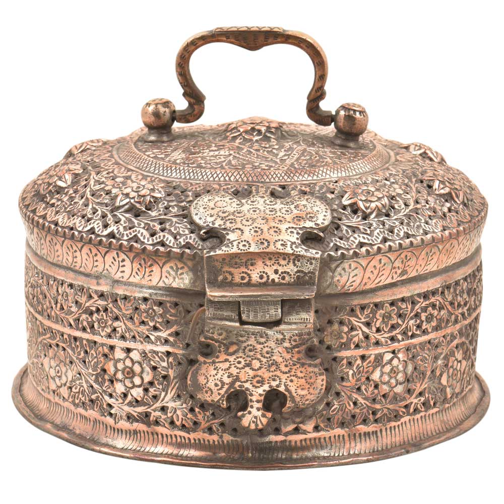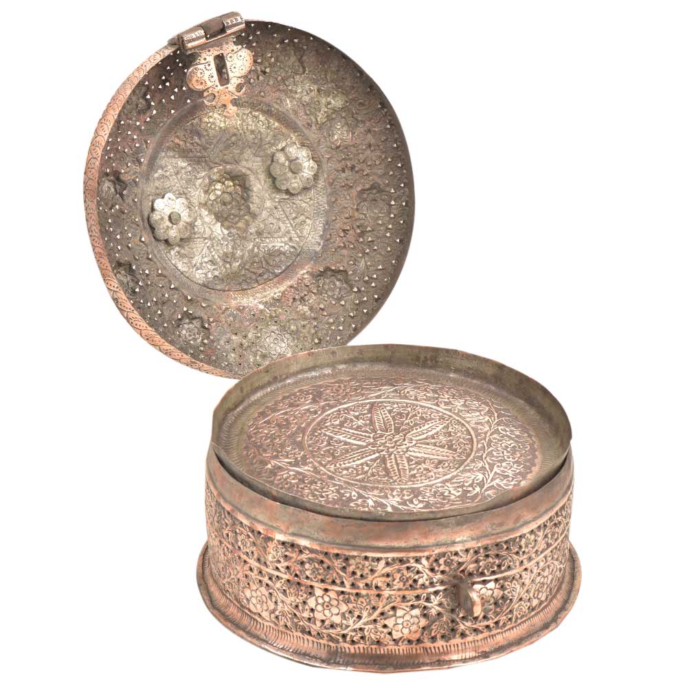 Hand Embossed Copper Betel Nut Pandan Box – with hand hammered floral and incised decoration used to store betel leaf, lime, tobacco and the nut from the areca palm. The practice of chewing betel nut was popular all over Asia and is still a common practice in Myanmar and India. This Pandan betel nut box contains six small pots, each incised on the tops and sides with the same design and metal.