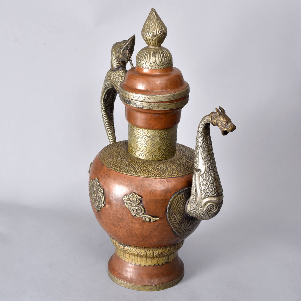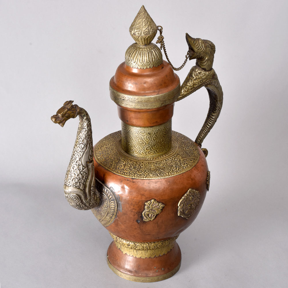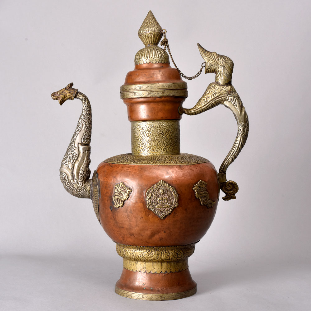 Elevate your tea time with this stunning vintage-inspired copper and white metal kettle. Adorned with captivating Tibetan art engraving, this kettle will transport you to the mystical Himalayas with every pour. Bring the allure of ancient Tibetan craftsmanship into your home with this exquisite kettle. The mesmerizing engraved design elevates the classic silhouette, making this piece a true work of art. Whether brewing a soothing cup of tea or adding a touch of elegance to your tablescape, this kettle will captivate onlookers and infuse your space with a sense of wonder. Designed for the tea connoisseur and decor enthusiast alike, this kettle is a must-have for those who appreciate the beauty of functional art. Imagine the joy of watching the warm glow of the copper body as you heat water for your favorite blend, or the delight of guests as they admire the intricate Tibetan motifs. This kettle is not just a utilitarian kitchen essential - it's a stunning conversation piece that will elevate your daily rituals.