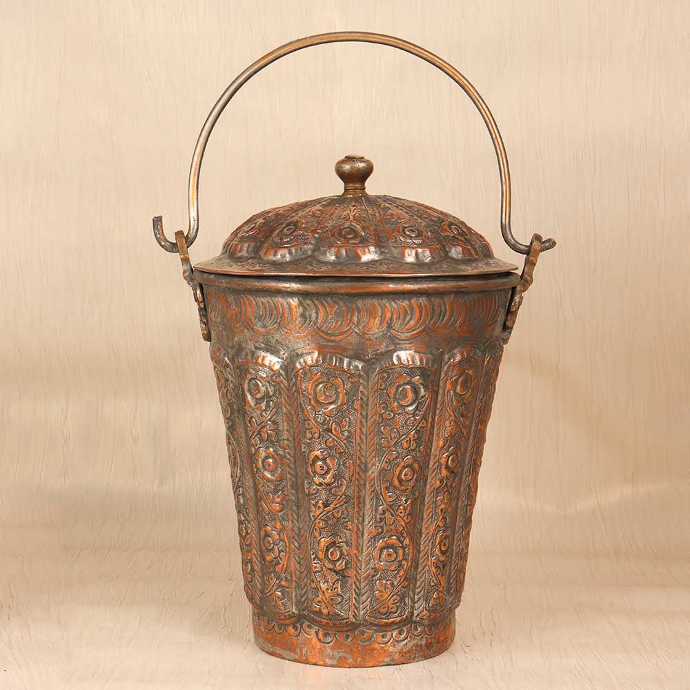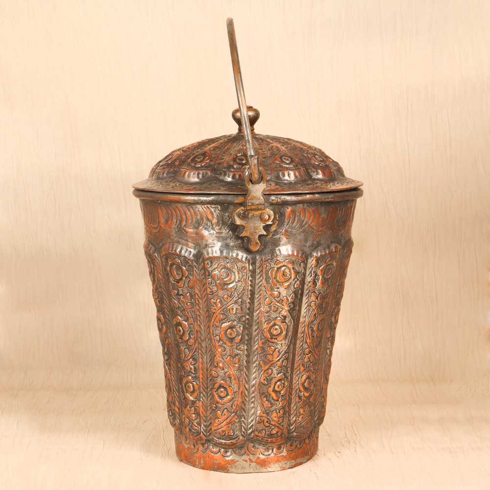 - Copper construction with lid and handle for carrying water and storing goods