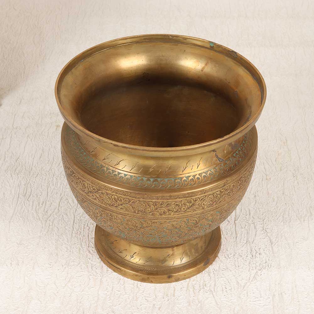 Immerse yourself in the intricate beauty of Indian design with this antique-inspired engraved brass planter. Crafted by hand in India using traditional techniques, each piece features unique patterns and motifs inspired by the vibrant artistic heritage of Rajasthan. This handcrafted planter adds an exotic, bohemian touch to any space. The engraved patterns seem to come alive against the golden brass patina, transporting you to the bazaars of an ancient Indian city. Place it in an entryway or living area to evoke the romance of faraway lands. For urban gardeners and design lovers, this brass planter elevates your indoor plants to an art form. The handmade craftsmanship gives it an heirloom-quality feel, making it a statement piece you'll treasure for years. Whether displayed alone or grouped with other accents, this planter infuses global inspiration into your home decor.