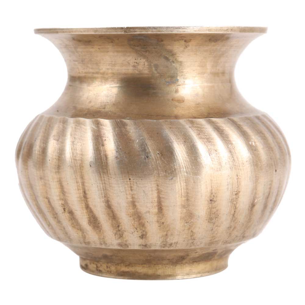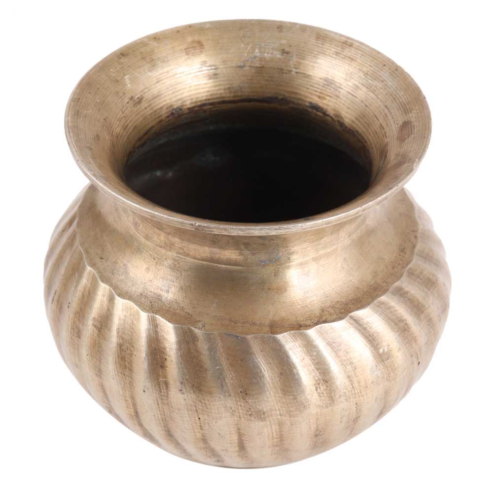 A bulbous brass water pot finely engraved with hand crafted design all over the vessel used to keep drinking water. Excellent Craftsmanship in hand carving done by the expert craftsmen. Use it to decorate your kitchen or as a display unit near your dining area. It can also be used as a flower pot on a coffee table.
