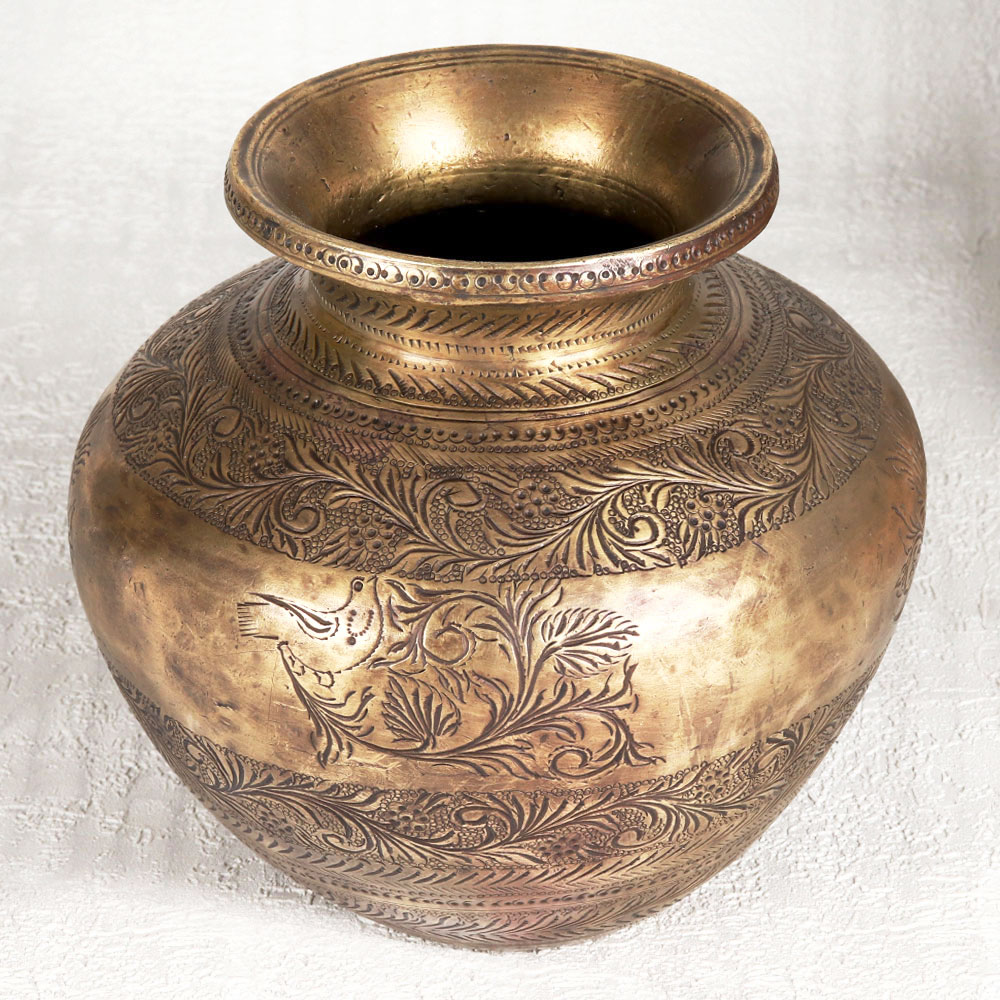 Adorn your interiors with the timeless elegance of our Vintage Brass Holy Water Pot. Crafted by professional Indian artisans with unwavering attention to detail, this exquisite piece is a testament to craftsmanship that transcends generations. This holy water pot boasts a rich antique brown finish that exudes a sense of vintage charm. Its surface is adorned with intricate engravings, each telling a story of dedication and artistry. Made from high-quality brass, this pot not only embodies lasting beauty but also offers durability that will withstand the test of time. Versatile in its functionality, this pot can seamlessly blend into various settings, whether it's your home, office, restaurant, hotel, cafe, or shop. Use it to accentuate your interior decor, as a unique flower pot, or during sacred rituals, havan ceremonies, or prayer sessions. For collectors, this piece is a rare gem, adding depth to your vintage collection or becoming a captivating exhibit at any showcase. It also makes for a thoughtful gift on special, festive, or auspicious occasions, allowing you to share the enduring charm and spirituality of this handcrafted masterpiece with your family, friends or relatives. Embrace the legacy of Indian craftsmanship with this Vintage Brass Holy Water Pot and infuse your spaces with its timeless allure.