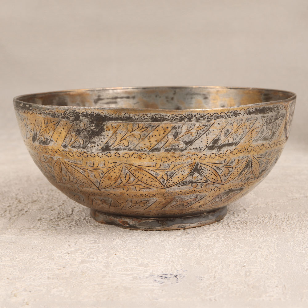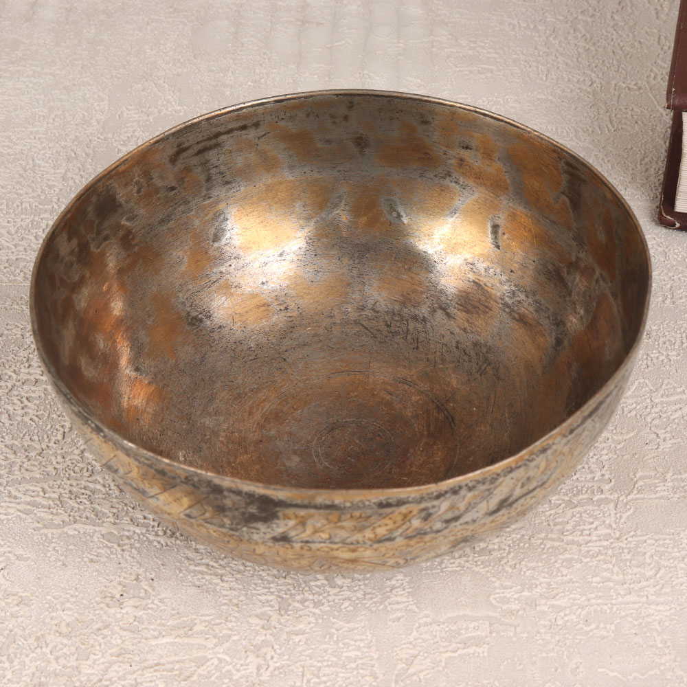A Brass Engraved Bowl that is a testament to the timeless artistry of Islamic craftsmanship. Handmade by skilled artisans, this captivating piece seamlessly blends tradition with sophistication. Crafted from high-quality brass, the bowl features an antique brown finish that accentuates its intricate designs, showcasing the rich heritage of Islamic art. The bowl's surface is adorned with meticulous engravings, each telling a story of cultural significance and unparalleled skill. Its vintage allure makes it a perfect decorative accent for various settings, including homes, offices, restaurants, hotels, or cafes. However, due to its antique nature, we recommend using it primarily for decorative purposes, adding a touch of historical charm to any space. This brass bowl is not just an ornament, it's an invitation to create a curated vintage collection. Its uniqueness makes it an ideal gift for your family, friends or relatives on special, festive, or auspicious occasions. Whether you're seeking to enhance your interior decor or looking for a distinctive present, this Brass Engraved Bowl is a timeless masterpiece that transcends time and cultural boundaries. Elevate your surroundings with the artistry and elegance of this handmade gem.