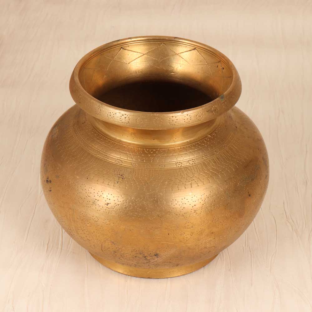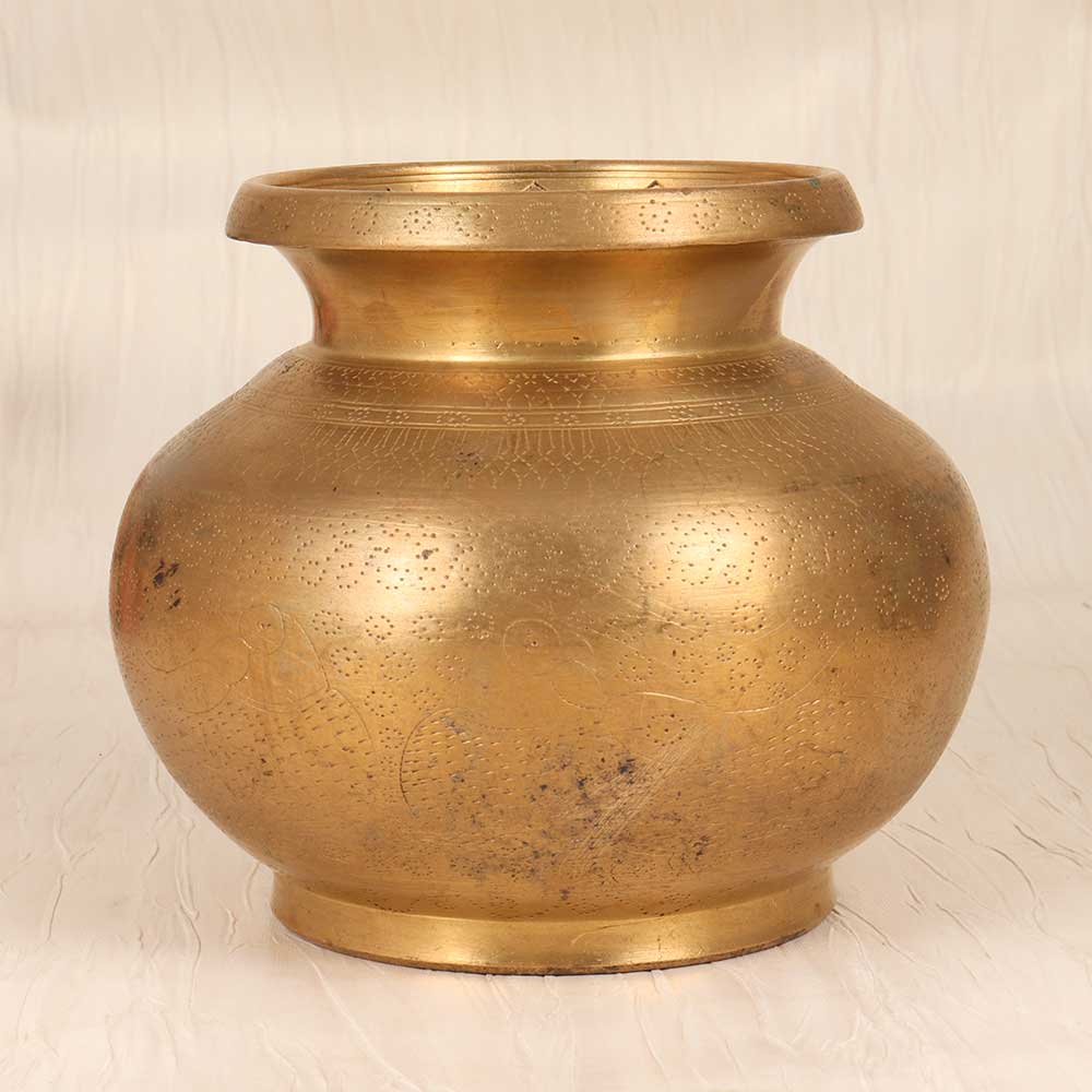 Steep yourself in tranquility and ritual with this antique brass holy water pot. Masterfully engraved with traditional patterns, this vessel was made to hold sanctified water for blessing and consecration. Its graceful form and intricate details are sure to elevate your sacred space. When you fill this pot with holy water and place it on your altar, you create an opportunity to slow down and focus your spiritual intention. The act of dipping your fingers into the cool water, then touching your forehead, heart space, and shoulders is meditative and grounding. Allow this simple ritual to open your mind, calm your body, and connect you to the divine. If you want to infuse your home with peace, meaning, and devotion, this vintage brass pot is for you. Use it to transform ordinary moments into mindful dedication, honoring heritage and higher purpose. Let its beauty, quality, and history inspire a sense of reverence.