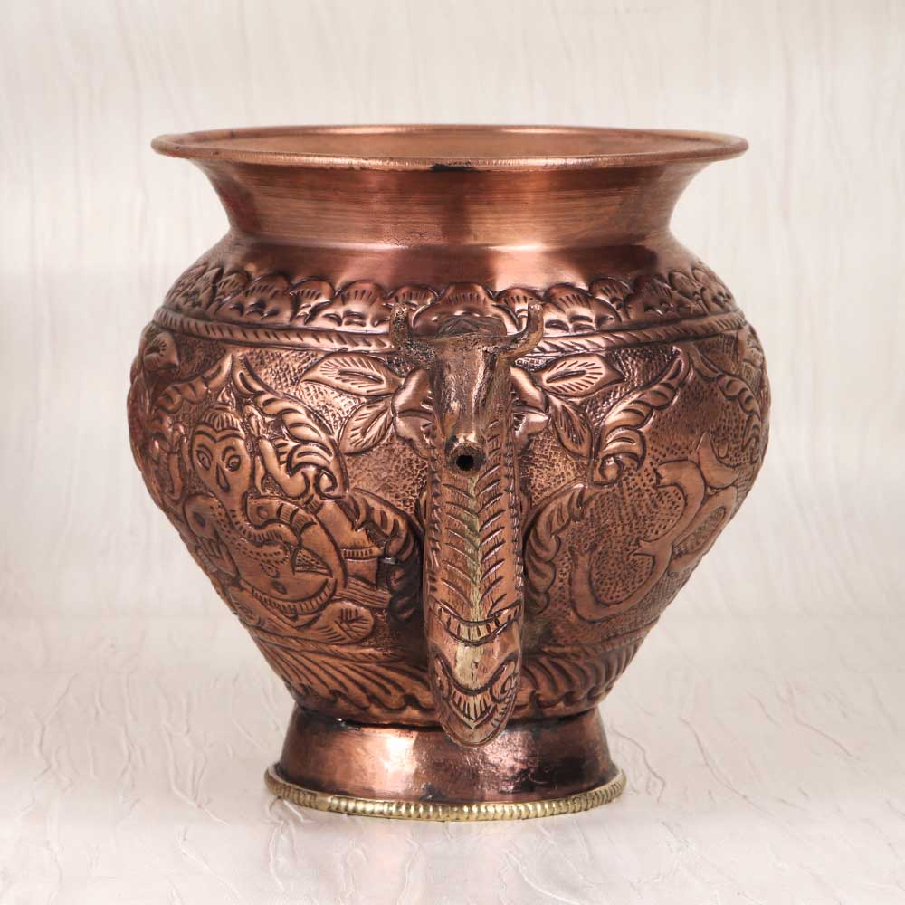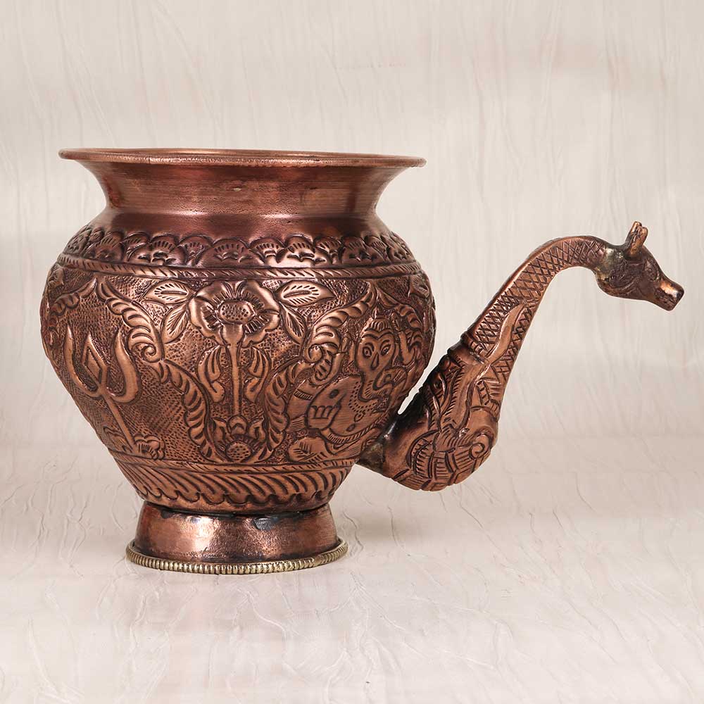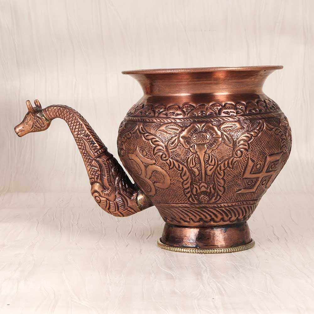 Elevate your drinking ritual with this handcrafted copper water pot. Featuring a graceful Nandi spout, floral engravings, and a stunning copper body, this pot merges old-world artistry with holistic wellness. Copper is an essential mineral for health and has been used for centuries in India because of its purification properties. When water sits in this copper pot overnight, trace amounts of copper leach into the water, making it more alkaline and improving hydration. Bring the wisdom of Ayurveda to your modern lifestyle with this handcrafted pot. Its antique design will remind you to slow down and drink mindfully, enhancing wellness. The copper pot makes a meaningful gift for yoga enthusiasts, holistic healers, and those seeking elevated drinking experiences. With its artisanal craftsmanship and ties to ancient practice, this pot will be a stunning addition to your home.