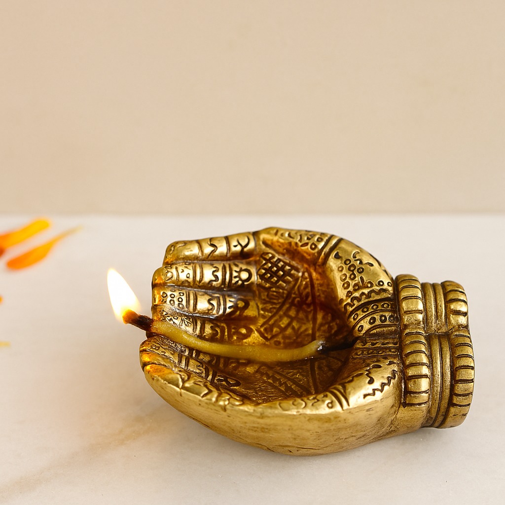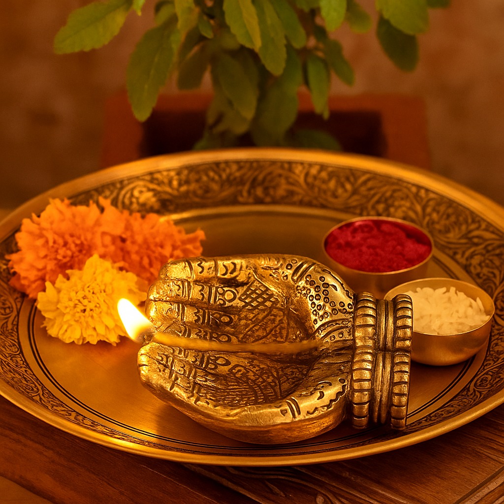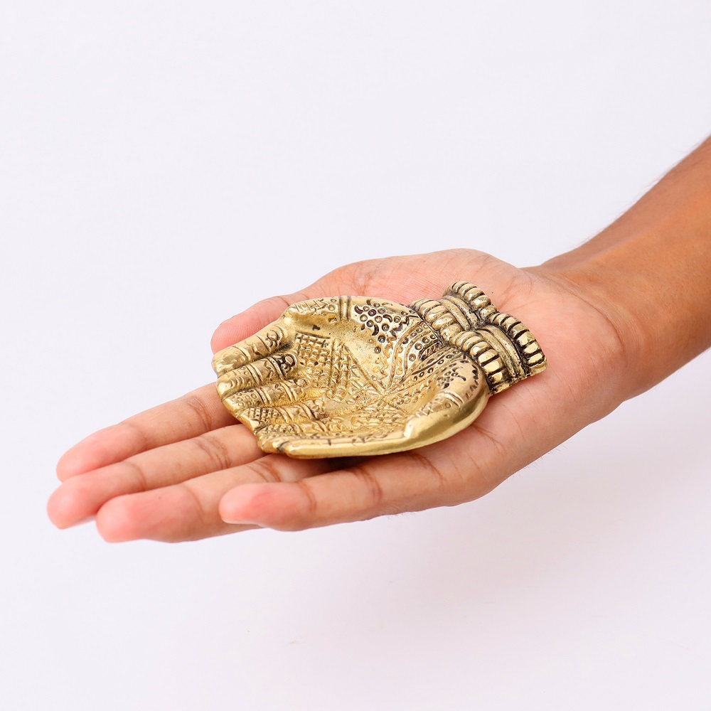 Bring home divine energy with the Engraved Design Two Hands Brass Diya Oil Lamp, a beautiful creation where two sculpted hands gracefully cradle the sacred flame. Made from solid brass with a golden polish, this diya combines artistry and spirituality, reflecting the offering of light to the divine. Perfect for temples, home mandirs, and festive occasions, it stands as a reminder of devotion and blessings.