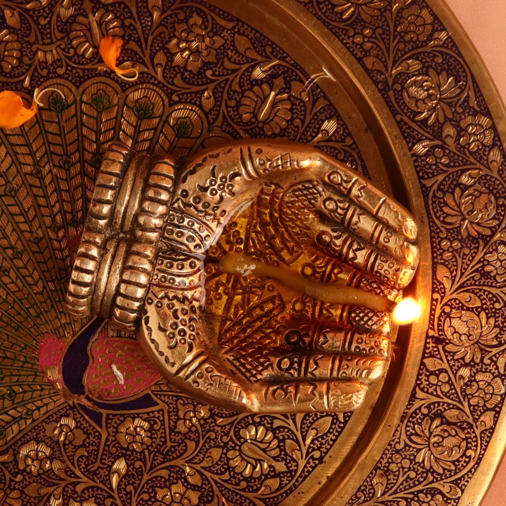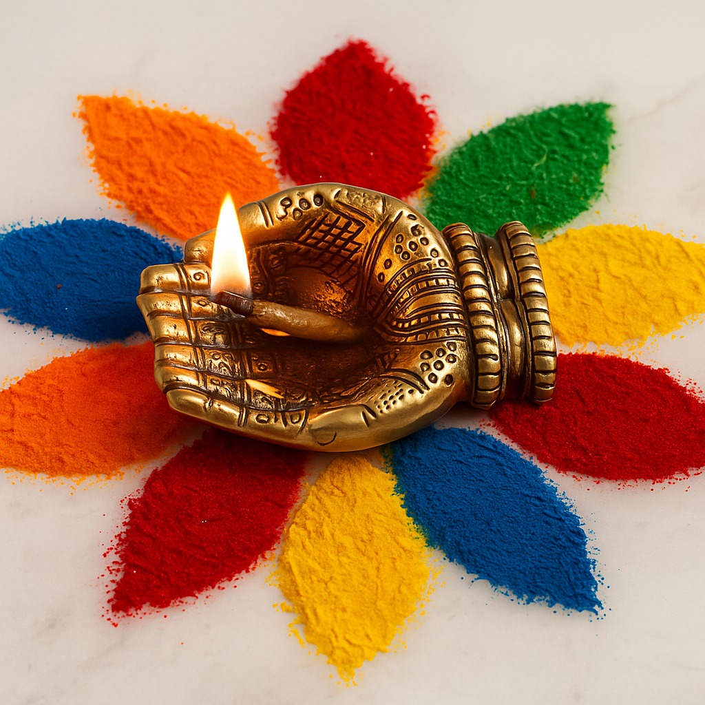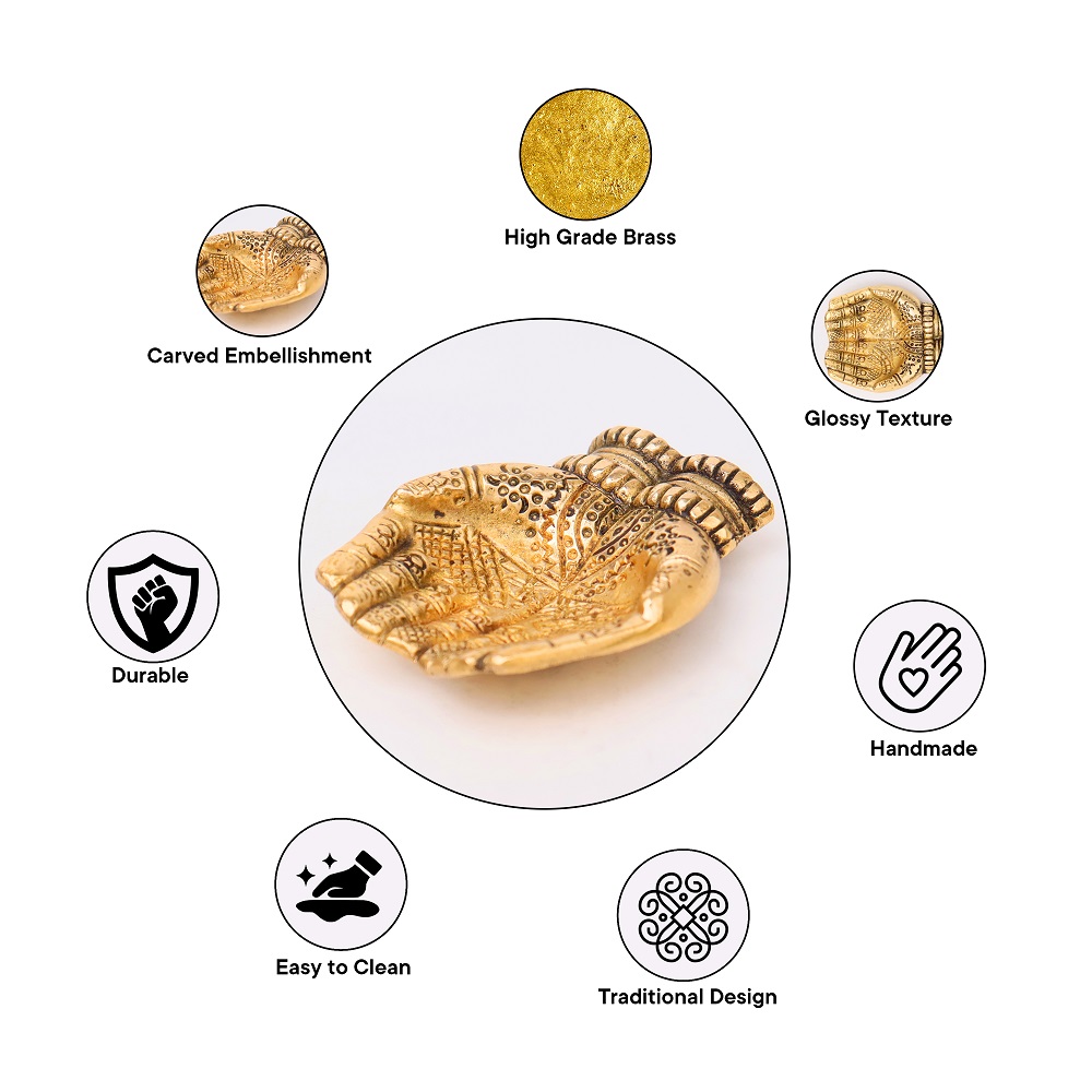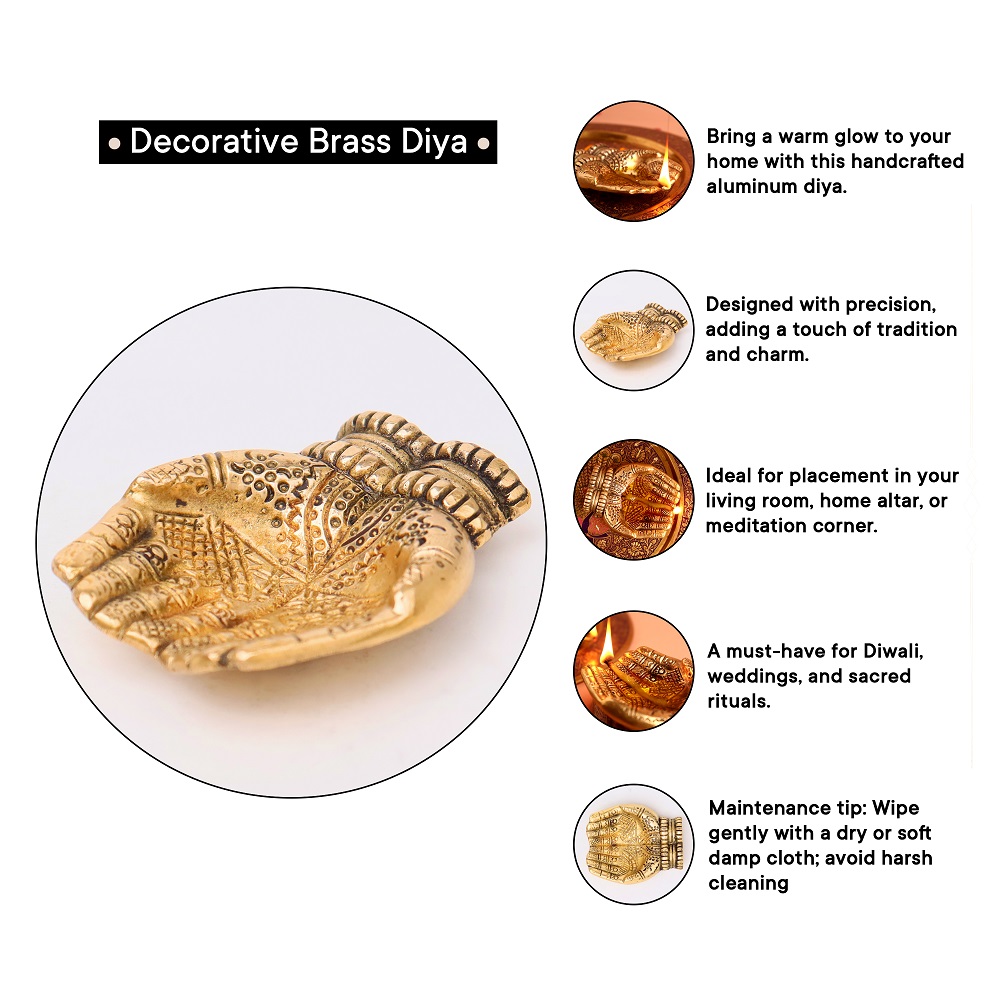 Bring home divine energy with the Engraved Design Two Hands Brass Diya Oil Lamp, a beautiful creation where two sculpted hands gracefully cradle the sacred flame. Made from solid brass with a golden polish, this diya combines artistry and spirituality, reflecting the offering of light to the divine. Perfect for temples, home mandirs, and festive occasions, it stands as a reminder of devotion and blessings.