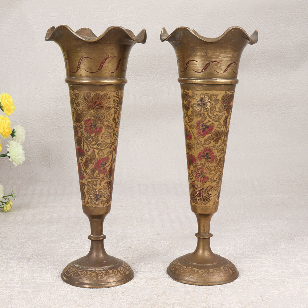 Adorn your home interior with our exquisite set of two vintage brass flower pots that are meticulously handcrafted by highly skilled artisans in the timeless tradition of Islamic Art. Each pot boasts a rich antique brown finish, adding a touch of opulence to any space. The intricate engravings on the brass surface showcase the artisan's dedication to detail, creating a piece that transcends mere functionality to become a work of art. Crafted from high-quality brass, these flower pots not only radiate charm but also promise durability. Versatile enough for placement in homes, offices, restaurants, hotels, or cafes, these pots seamlessly blend into any environment. Ideal for indoor floral arrangements, they bring a touch of nature indoors, transforming your space into a haven of elegance. This vintage brass flower pot set is not just a decorative piece; it's a statement, a nod to the beauty of Islamic Art and the craftsmanship of the artisans who brought it to life. Perfect for collectors of vintage treasures, this set adds a unique charm to any collection. Consider it as a thoughtful gift for your family, friends or relatives on special, festive, or auspicious occasions—an enduring symbol of appreciation for artistry and timeless beauty.