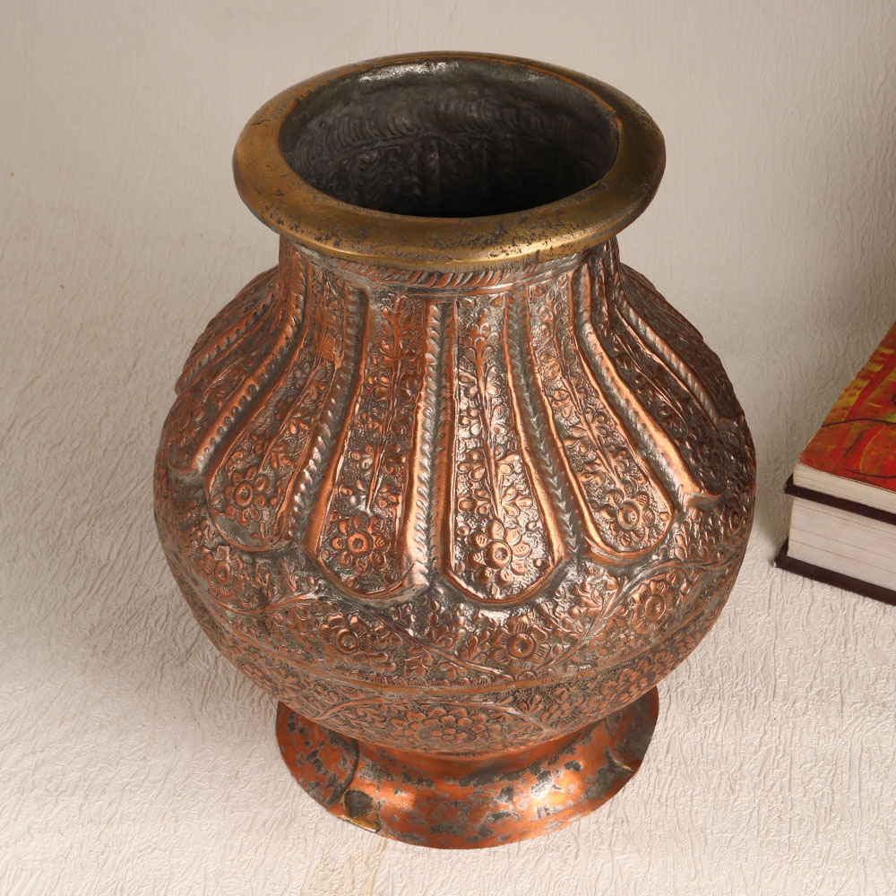 Adorn your interior with the timeless elegance of this exquisite vintage copper pot. Handcrafted by highly skilled Indian artisans in the iconic Islamic Art style of Hyderabad, this piece showcases exceptional craftsmanship and intricate carving. Its antique brown finish exudes an aura of vintage charm, making it a captivating addition to any space. Crafted from high-quality copper, this pot radiates an enduring luster, and its sturdiness ensures its longevity. Its versatility is unmatched, as it can enhance the ambiance of your home, office, restaurant, hotel, cafe, or shop. Whether it's displayed as a unique flower pot or integrated into a curated vintage collection, this pot adds a touch of grandeur to any setting. This striking piece also makes for a thoughtful gift, perfect for special, festive, or auspicious occasions. Share the beauty of Indian artistry and history with your family, friends or relatives, and let this vintage copper pot become a cherished heirloom in their homes. Embrace the splendour of the past while infusing it with contemporary elegance through this captivating work of art.