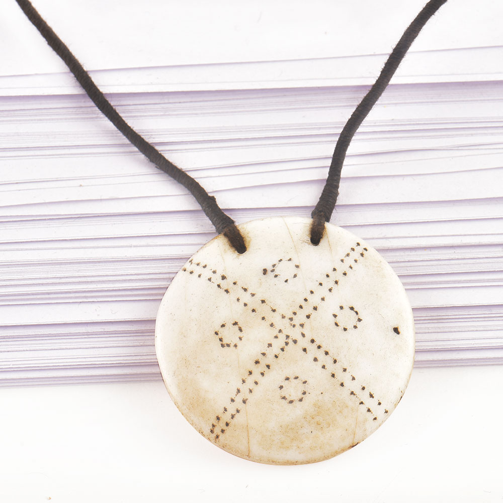 This single engraved geometric design on seashell pendant is made by the local artisans of India .The jewelry is made of a number of shell or two to three whole shells that are drilled with adjustable black thread which makes it easy to wear and fit.