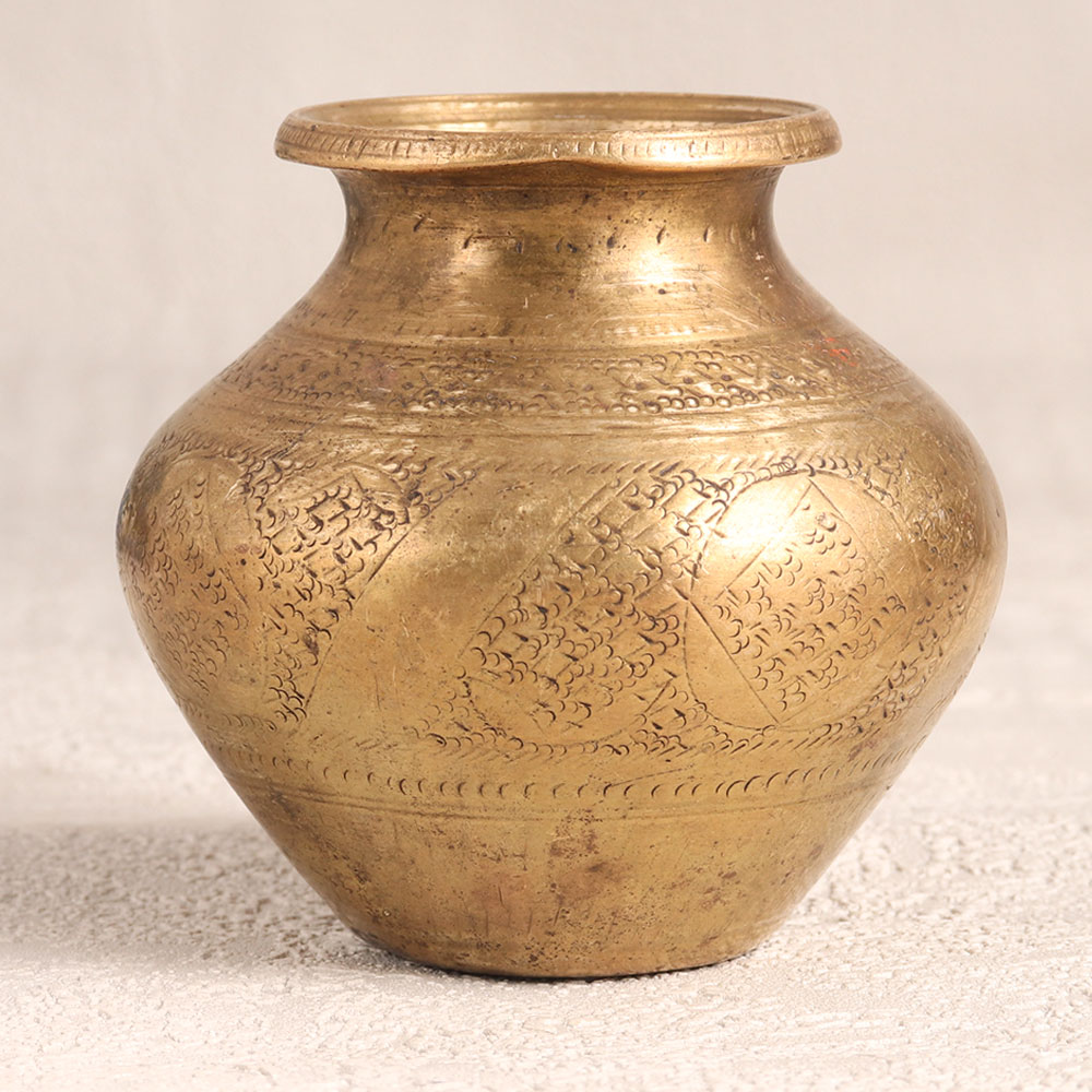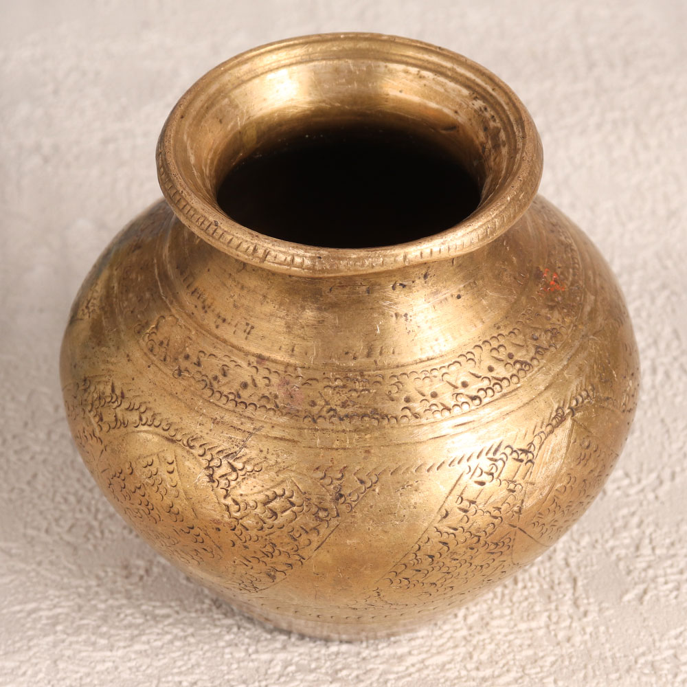 This Vintage Brass Holy Water Pot is a magnificent piece handcrafted by highly skilled Indian artisans hailing from the historic state of Gujarat, India. Crafted with meticulous precision, this holy water pot exudes the essence of traditional artistry and spirituality. Forged from high-quality brass, the pot is characterized by an antique golden finish that not only adds a touch of opulence but also showcases intricate engravings that tell a story of devotion and heritage. This timeless piece is a beautiful addition to any space – be it your home, office, hotel, cafe, shop, or restaurant prayer room. Its versatility is truly captivating, as it can be used both as a sacred vessel during prayer and as a charming small flower pot. Placing it in your space is believed to infuse positive energy, promoting harmony and serenity within your surroundings. Furthermore, this vintage brass holy water pot is a collector's dream, adding a touch of history and culture to your collection. It can also be an impressive exhibit at an antique showcase or exhibition. Share the beauty and spirituality of this masterpiece with your family, friends or relatives on special, festive, or auspicious occasions. A gift that not only radiates elegance but also carries a profound spiritual significance.