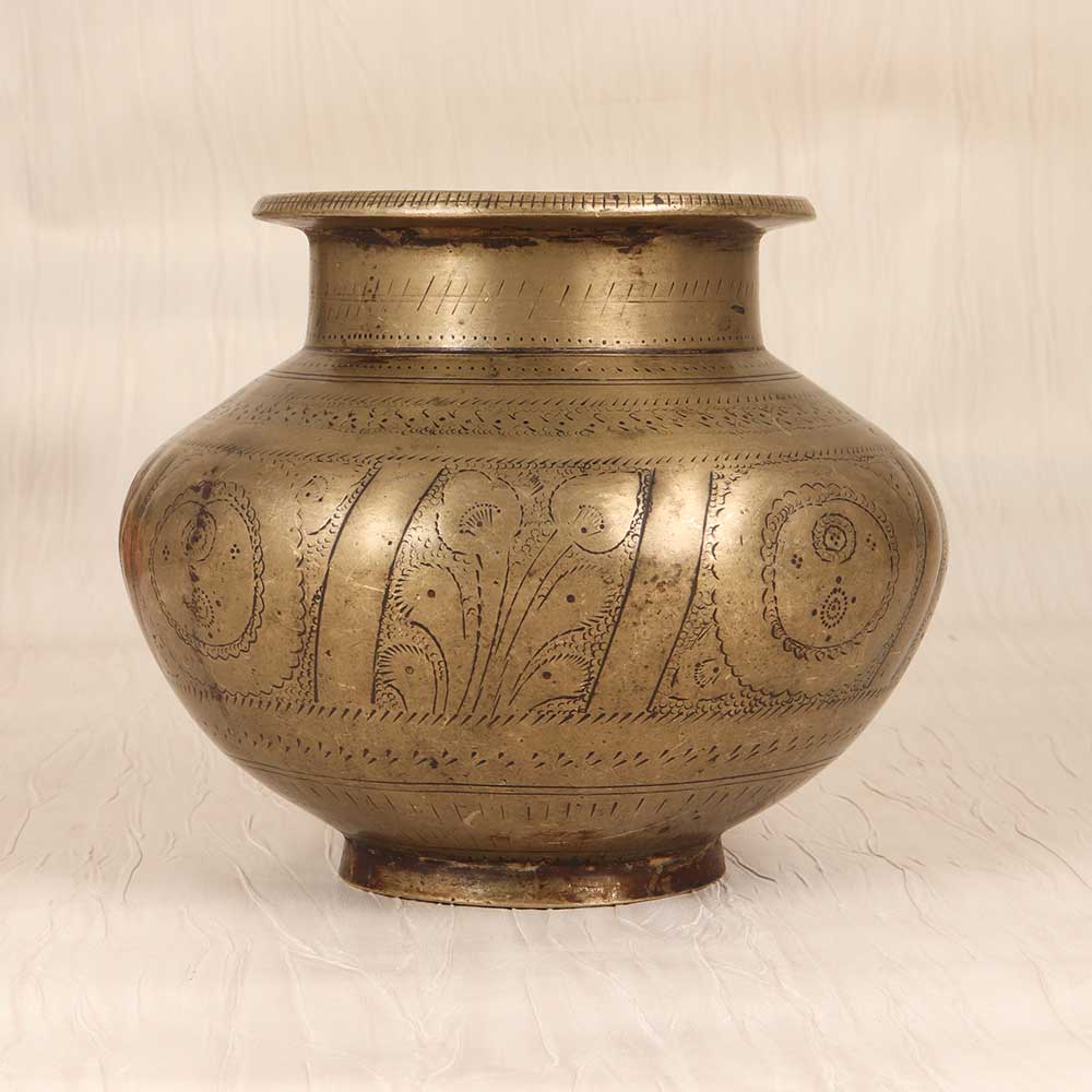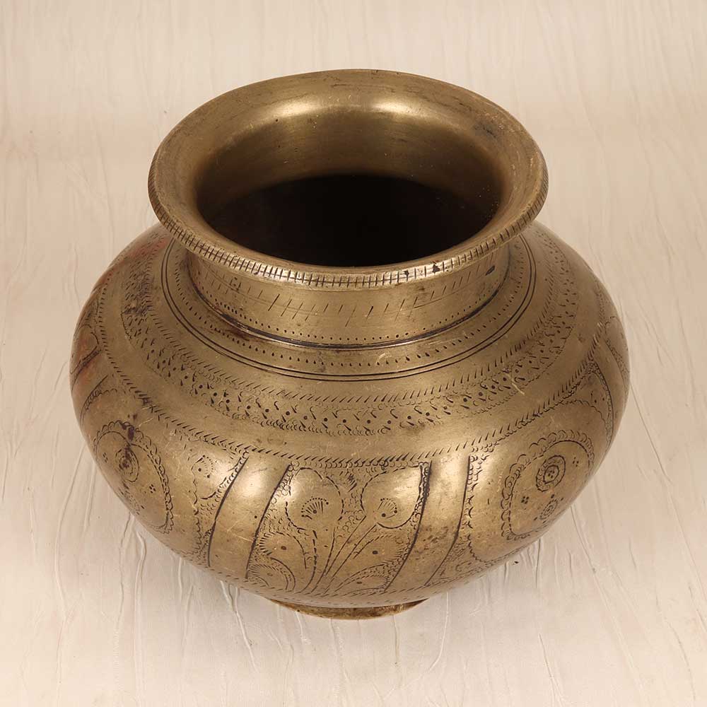 Step into the bygone era of Indian royalty with this hand engraved vintage brass holy water pot. Its antique patinated finish and intricately etched patterns hark back to the rich craftsmanship of Rajasthan. Use this pot to store holy water for puja or blessing your home. Its traditional form and engraving make it a meaningful spiritual accessory. The vintage look adds antique charm to modern as well as traditional decors. A perfect housewarming or wedding gift to impart positive energy.