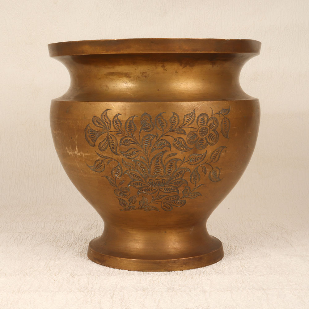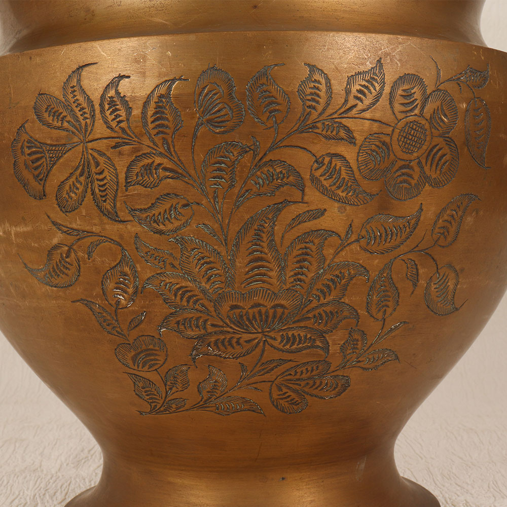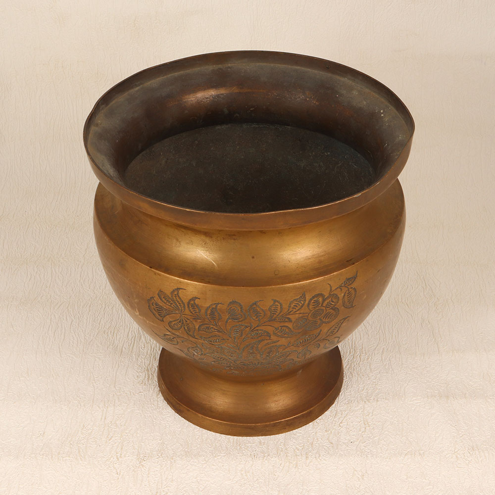 This Vintage Brass Flower Pot is a masterpiece crafted by highly skilled and experienced Indian artisans in the rich tradition of South Indian Art. Handmade with precision and care, this exquisite flower pot boasts a stunning floral engraving, showcasing the artistry that has been passed down through generations. Made from high-quality brass, the pot features an antique brown finish, adding a touch of vintage charm to any space. It’s warm, earthy tones make it a versatile decor piece suitable for various settings, including homes, offices, restaurants, hotels, or cafes. Perfect as an indoor flower pot, it effortlessly blends with any interior design style, bringing a touch of sophistication and cultural heritage. This vintage brass flower pot is not merely a decorative item; it's a collector's dream. Elevate your space with a piece that transcends time and trends. Whether you're looking to enhance your vintage collection or searching for a thoughtful gift, this flower pot is a symbol of craftsmanship and tradition. Share the joy by gifting it to your family, friends or relatives on special, festive, or auspicious occasions, creating memories that will last a lifetime.