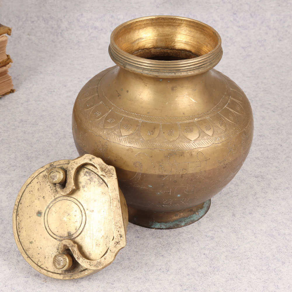 Enhance your spiritual space with the timeless allure of the Vintage Brass Gangajali Pot. Crafted by highly skilled Indian artisans from premium brass, this sacred vessel boasts exquisite engravings and a distinguished antique brown finish, capturing the essence of traditional craftsmanship. Designed with a secure lid and a gracefully adorned handle, this pot mirrors the elegance found in temples and is an ideal addition to home, office, restaurant, hotel, or cafe prayer rooms. Versatile and ornate, the Gangajali Pot serves not only as a ritualistic accessory but also as a captivating decorative piece, perfectly blending spirituality with aesthetic charm. Handmade with precision and care, it's a testament to India's rich artisanal heritage. Whether you're building a vintage collection or seeking a unique gift for your family, friends or relatives on special, festive, or auspicious occasions, this pot embodies cultural significance and timeless beauty. Embrace the divine energy and cultural legacy that this exquisite brass creation brings to your sacred and secular spaces alike.