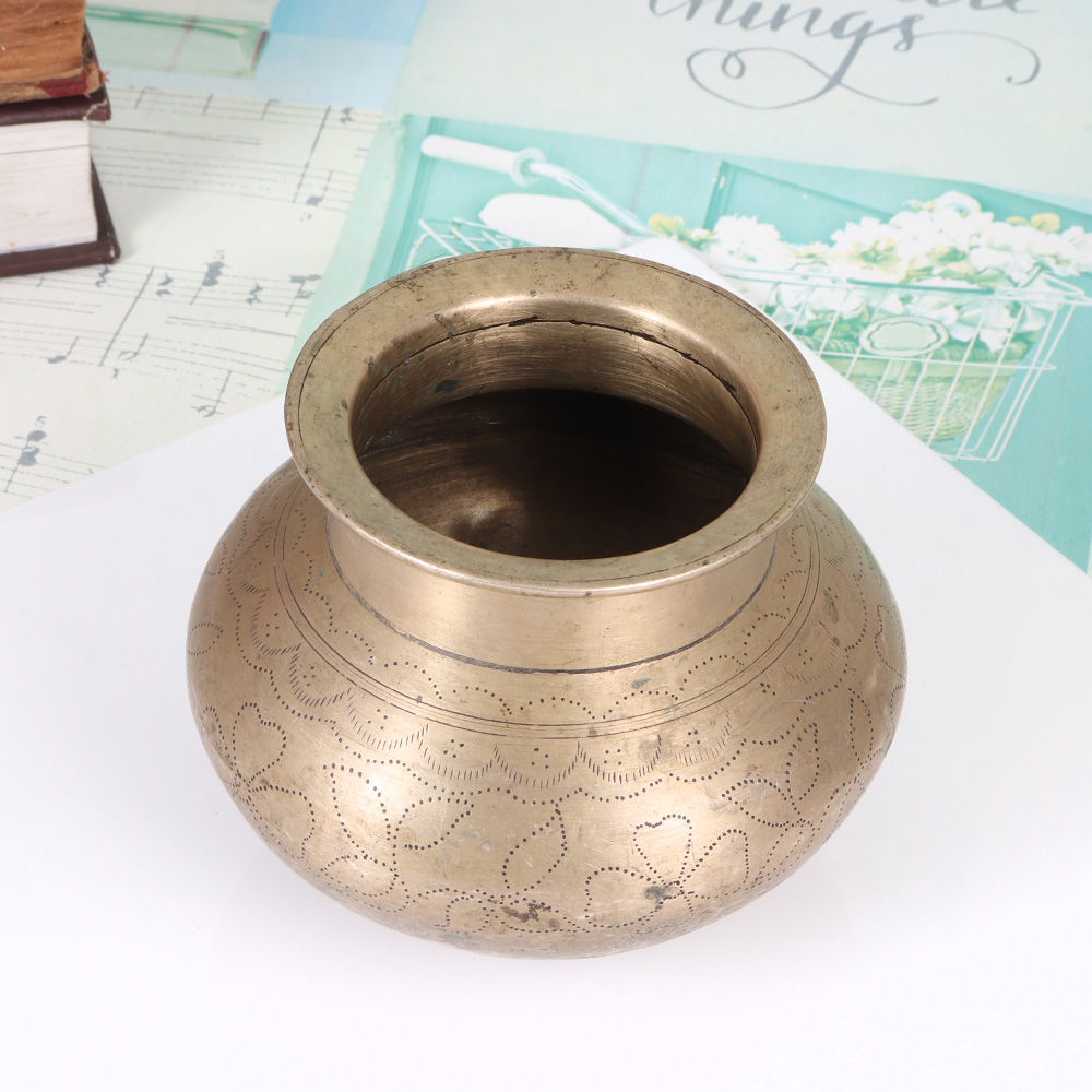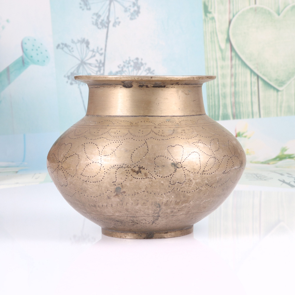 Elevate your spiritual practice and infuse your home with a sense of timeless elegance with this exquisite brass holy water pot. Crafted by skilled artisans in the vibrant region of Gujarat, India, this vintage-inspired vessel is a testament to the enduring power of traditional craftsmanship. This holy water pot is more than just a functional ritual item - it's a work of art that invites you to deepen your connection to the sacred. Fill it with consecrated water and use it to bless your home, perform puja ceremonies, or simply admire its captivating beauty. The solid brass construction ensures long-lasting durability, while the ornate carvings lend an air of reverence and authenticity to your spiritual practice. Whether you're a seasoned practitioner or new to the world of ritual, this brass holy water pot has the power to transform your daily life. Infuse your space with the wisdom and serenity of the ages, and let the timeless beauty of this vessel inspire you to live with greater intention and mindfulness. Embrace the transformative power of ritual and elevate your spiritual journey with this exquisite addition to your sacred collection.