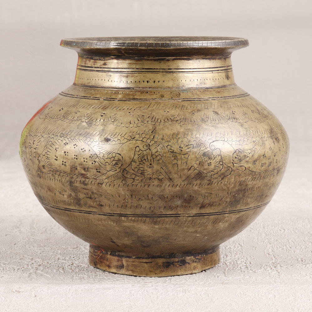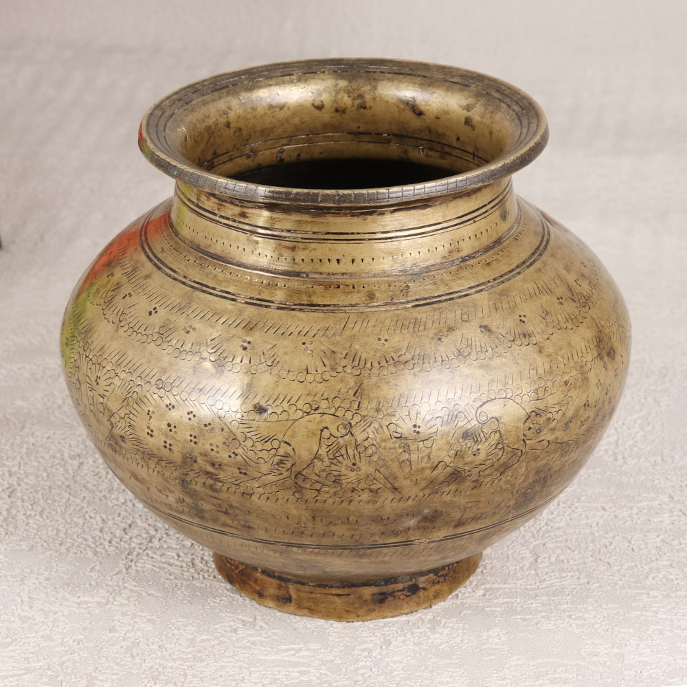 Buy a Vintage Brass Holy Water Pot online which is a timeless masterpiece meticulously handcrafted by highly skilled and experienced artisans from Northern India. This exquisite piece, with its intricate carvings and antique brown finish, embodies the rich cultural heritage of the region. Perfect for prayer, havan, and auspicious occasions, this pot serves as a vessel for holding sacred water or adorning with vibrant flowers. Crafted from high-quality Brass, the pot reflects the artisan's dedication to precision and traditional craftsmanship. Its versatile design allows it to enhance the ambiance of homes, offices, restaurants, hotels, or cafes, serving both a functional and decorative purpose. This unique artefact seamlessly blends spirituality with artistry, making it a coveted addition to any vintage collection. Share the divine energy by gifting this holy water pot to your family, friends or relatives on special, festive, or auspicious occasions, creating lasting memories and a connection to the cultural roots of Northern India.