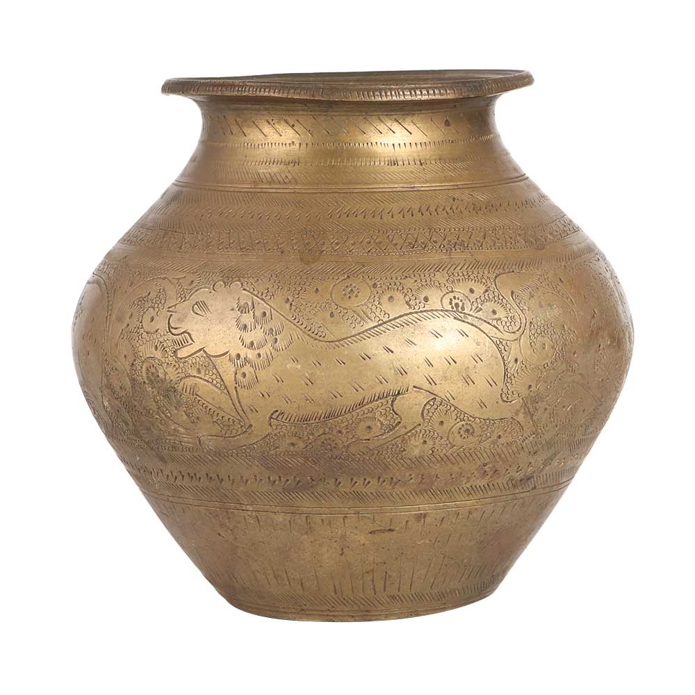 Buy an engraved holy water pot made of high quality bell metal to beautify the interior. It is handmade by highly skilled and experienced Indian artisans from Himachal Pradesh using traditional methods. Place this indoor planter on the table, shelf or altar to add an alluring flair to the decor. It is carved with beautiful animal like elephant and tiger and lovely motifs that make it an eye-catching piece for indoor decoration. Water pots or lota are used to store sacred water in the havans, rituals and auspicious functions. This water pot is more durable, long lasting and sturdy than any other plastic pot. Gift this incredible pot to your loved ones on special and festive occasions.