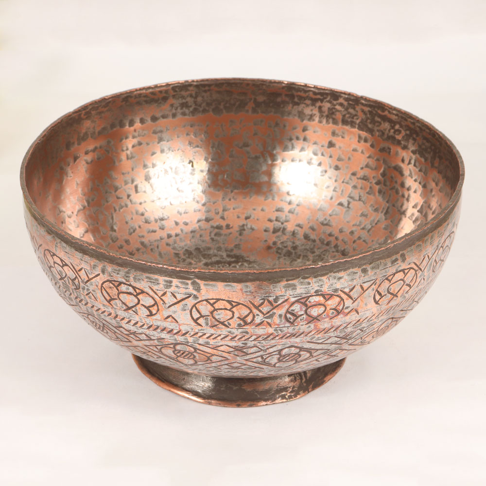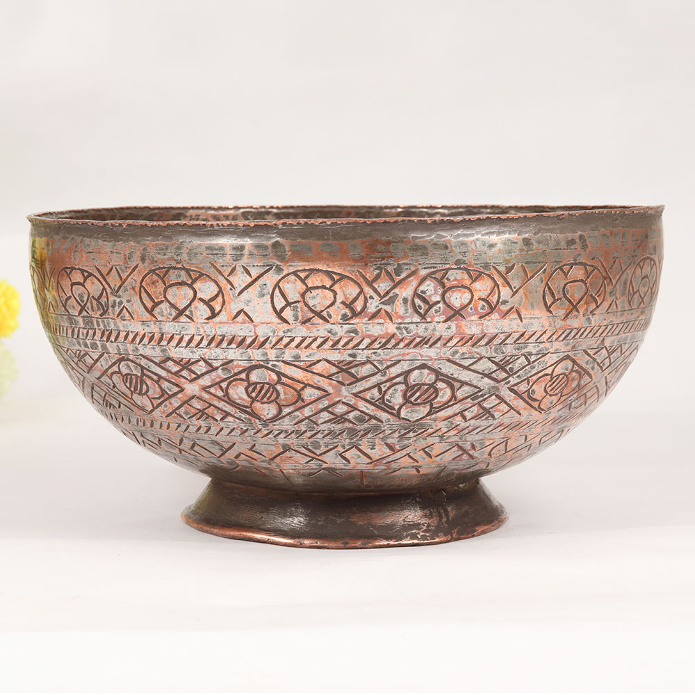 Decorate your living room with our exquisite Vintage Copper Bowl that is a testament to the timeless beauty of Islamic Art. Handcrafted by talented artisans, this piece showcases intricate engravings on high-quality copper, exuding both elegance and historical charm. The antique brown finish adds a touch of authenticity, making it a versatile addition to any setting - be it at home, in the office, a restaurant, hotel, or cafe. This versatile bowl serves as more than just a decorative item; it doubles as an indoor flower pot, infusing nature into your living spaces. Its rich history and unique design also make it a prized addition to any vintage collection. Moreover, the Vintage Copper Bowl makes for a thoughtful and cherished gift for your family, friends or relatives on special, festive, or auspicious occasions. Embrace the beauty of craftsmanship and tradition with this one-of-a-kind piece that seamlessly blends artistry and functionality.