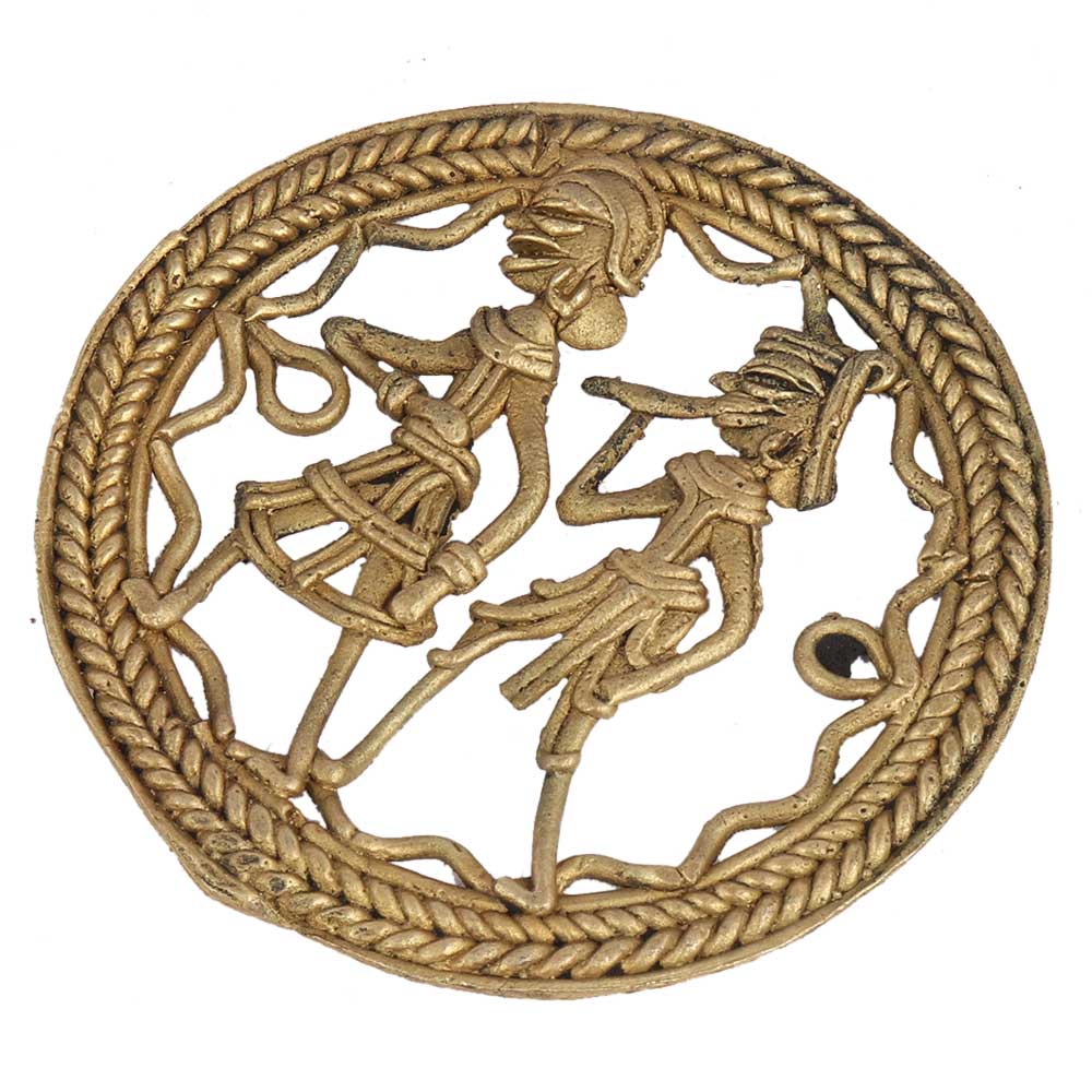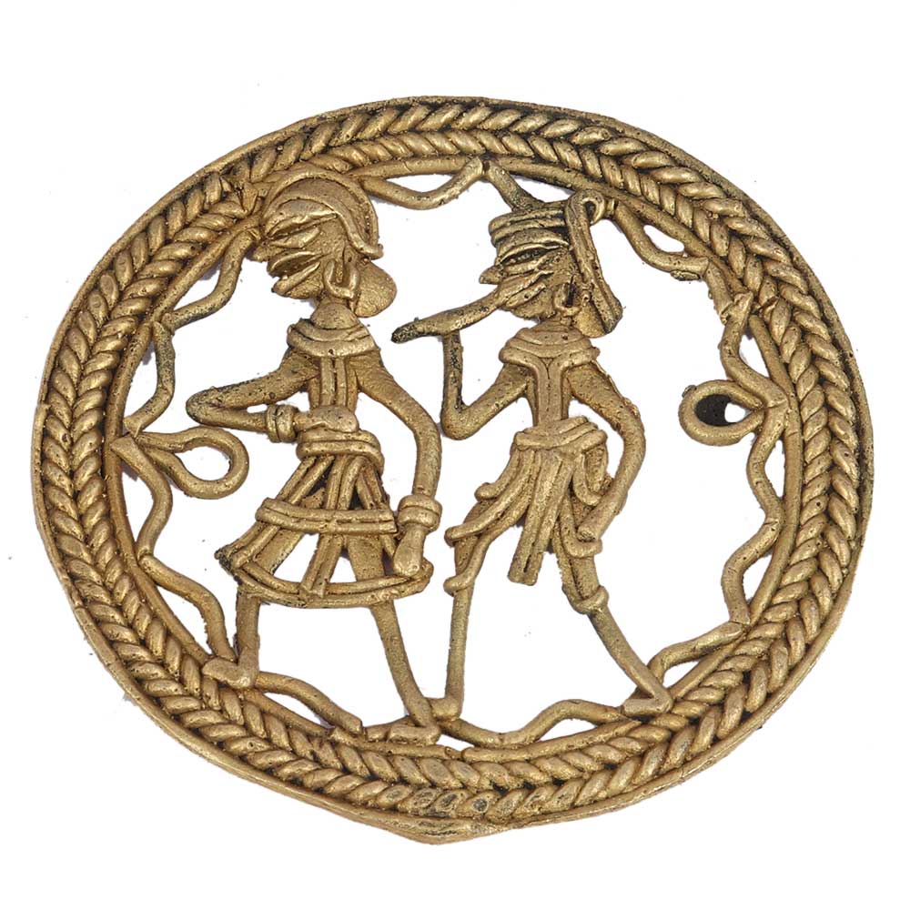 Round Brass Dhokra Tribal Hunting Couple Wall Hanging with intricate lattice ornamentation and intricate design with a round frame. framed or simply mounted on the wall or just placed on the table against the wall. Wedding gift, anniversary gift, house warming gift for your friends and family.