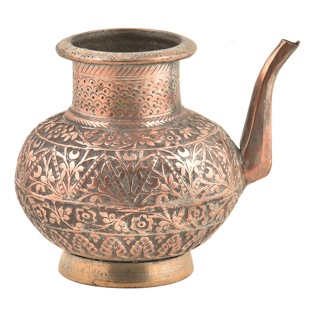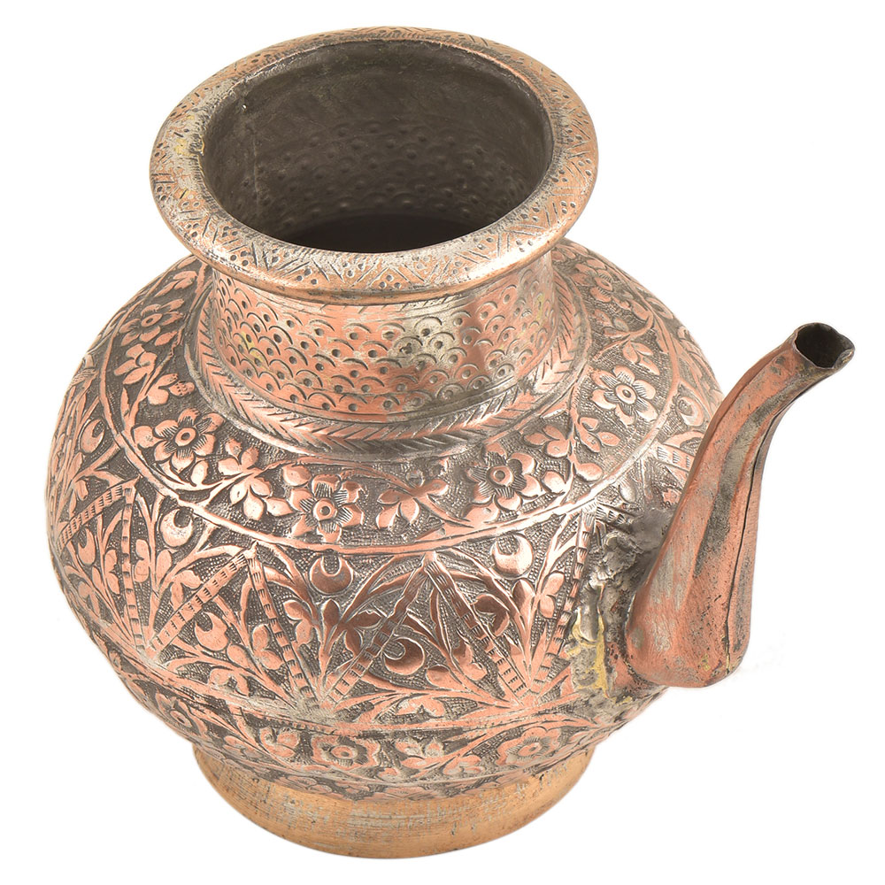 Copper hand engraved hand hammered islamic style holy water pot made by expert artisans of India. This beautiful hand engraved copper pot with exclusive floral design all over the surface of the pot with a stout is ready for part of your Royal collection.