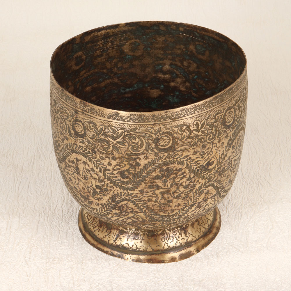 Adorn your living room with the timeless charm of this exquisite Vintage Brass Pot that is a masterpiece crafted by highly talented Indian artisans hailing from the culturally rich region of South India. Meticulously handmade from high-quality brass, the pot boasts a stunning antique brown finish that lends an aura of classic elegance to any setting. The pot is adorned with enchanting engravings featuring intricate depictions of birds and animals, showcasing the artisan’s exceptional craftsmanship and attention to detail. This one-of-a-kind piece seamlessly blends traditional aesthetics with modern sensibilities, making it a versatile addition to various environments, including homes, offices, restaurants, hotels, or cafes. Its purpose extends beyond mere decor – doubling as an indoor flower pot, the Vintage Brass Pot breathes life into any space it graces. This piece is not just an item of beauty but a symbol of heritage and artistry, making it an ideal addition to any vintage collection. Furthermore, with its timeless appeal, it serves as a thoughtful and meaningful gift for your family, friends or relatives on special, festive, or auspicious occasions, offering a touch of cultural richness and artistic excellence to their lives.