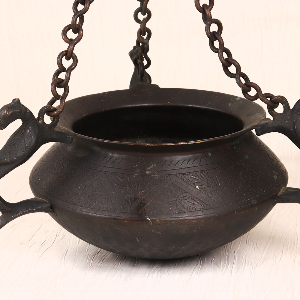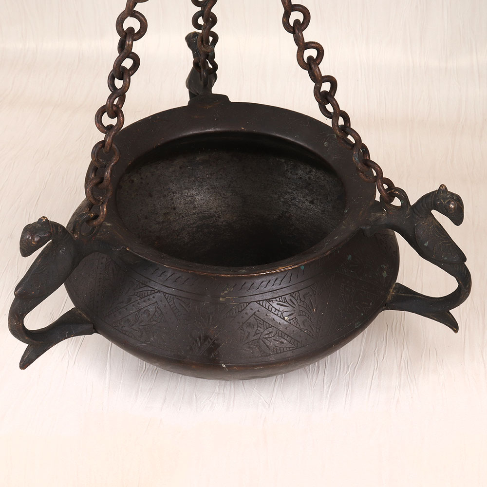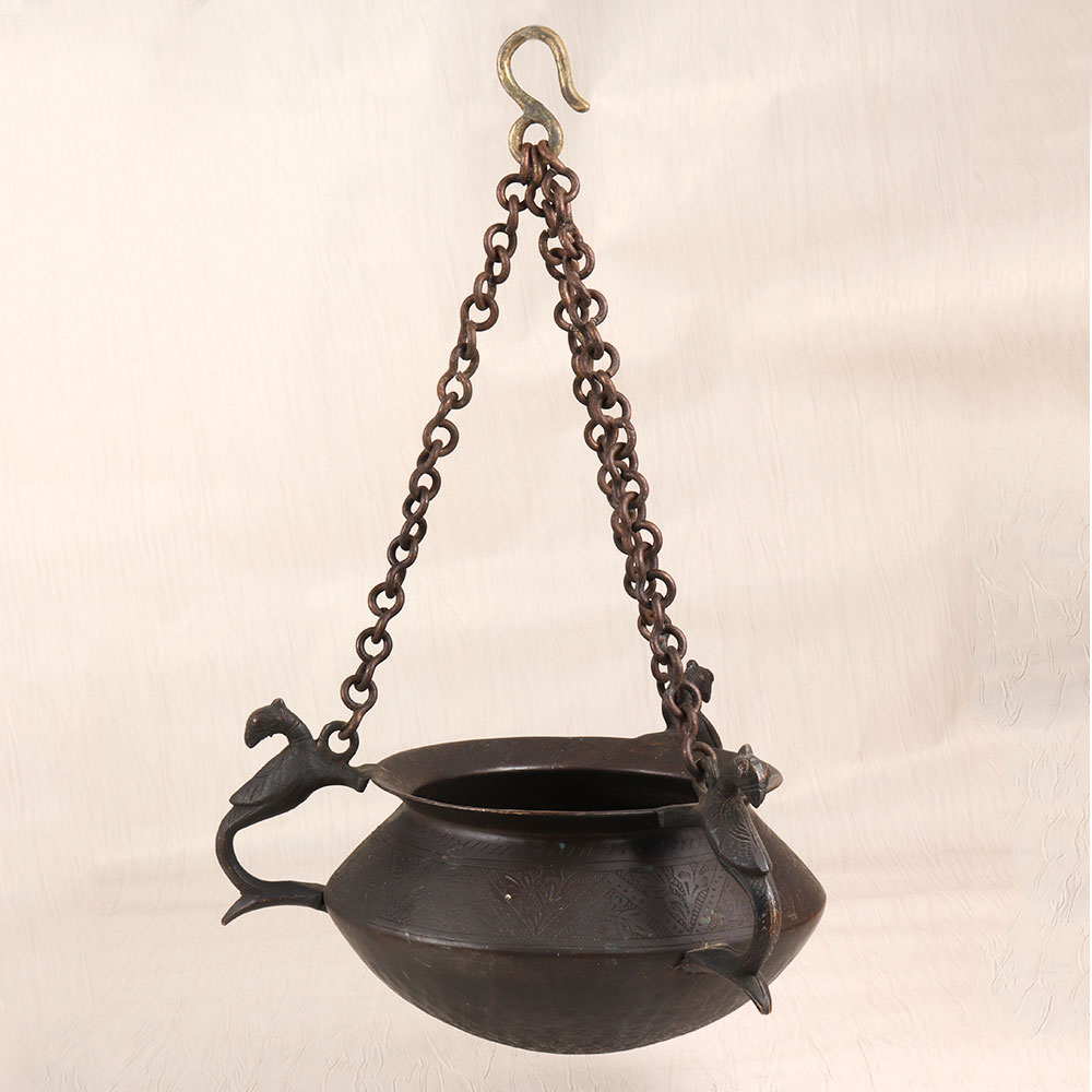 Step back in time with the mesmerizing vintage brass hanging pot, a true masterpiece of craftsmanship. Adorned with a stunning peacock carving and intricate engraving, this pot exudes a sense of timeless elegance that will elevate any room in your home. This vintage brass hanging pot is more than just a functional piece - it's a statement of your refined taste and appreciation for the beauty of the past. Whether you're looking to add a touch of vintage charm to your living room, bedroom, or office, this captivating pot will effortlessly blend with your existing decor, becoming the focal point of your space. Imagine the endless possibilities: fill it with lush, trailing vines, fragrant herbs, or even use it as a unique storage solution for your treasured trinkets. No matter how you choose to display it, the vintage brass hanging pot will ignite a sense of wonder and admiration in all who lay eyes on it. Elevate your space and embrace the allure of vintage brass. Invest in a piece that will continue to captivate and inspire for years to come.