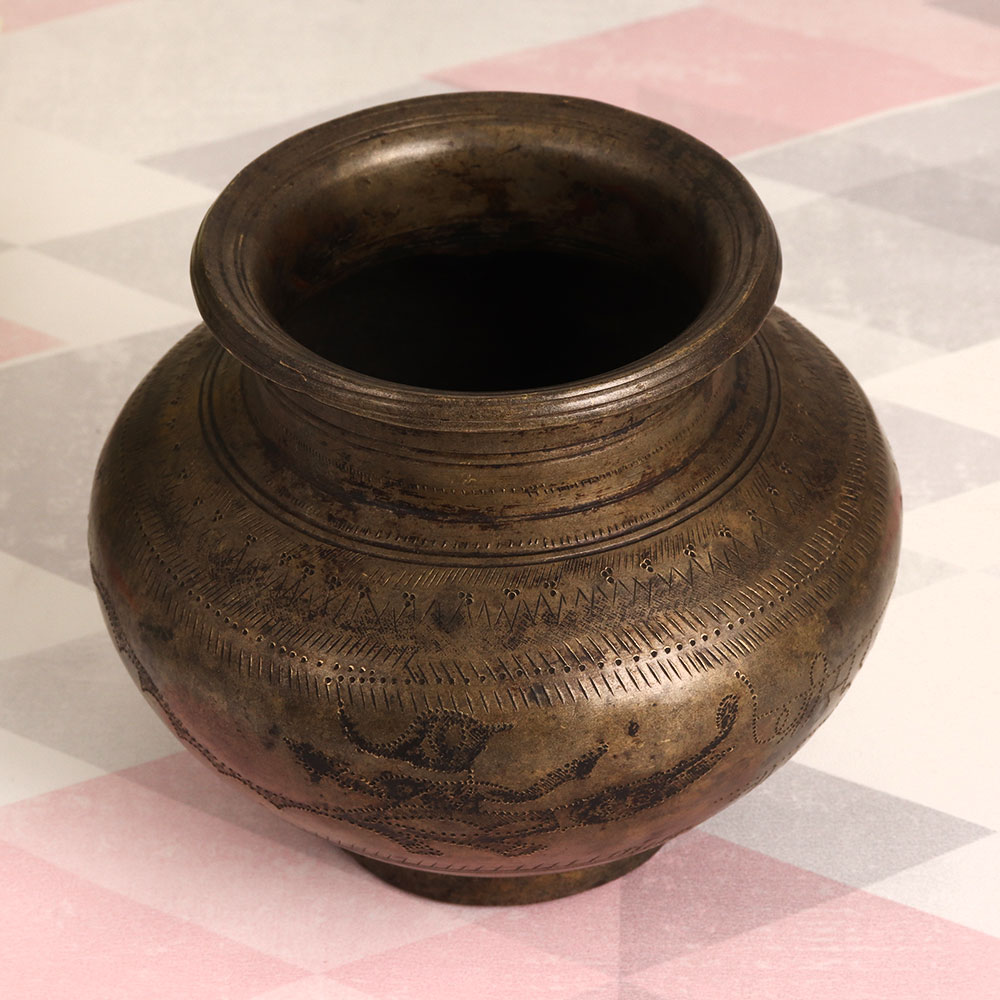 Enhance your living spaces with a touch of South Indian artistry and tradition, embodied in this exquisite Vintage Brass Holy Water Pot. Crafted by talented Indian artisans, this piece is a testament to their mastery in handcrafted metalwork. Made from high-quality brass, it features intricate engravings that reflect the rich cultural heritage of South India. The antique brown finish adds a timeless allure to this piece, making it a captivating addition to your home, office, restaurant, hotel, cafe, or shop. Not only does it serve as a stunning indoor flower pot, but it also carries profound spiritual significance. This pot is perfect for holding holy water during havans, rituals, and auspicious occasions, allowing you to partake in ancient traditions. Adding this Vintage Brass Holy Water Pot to your collection brings an aura of vintage charm, making it a captivating conversation piece. It also makes for a thoughtful and culturally rich gift for your family, friends or relatives on special, festive, or auspicious occasions, letting them bask in the warmth of tradition and artistry.