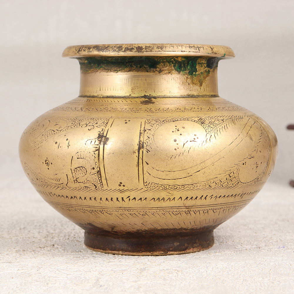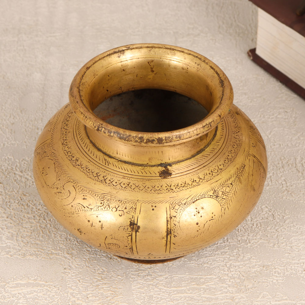 Enhance your spiritual space with this exquisite Vintage Brass Holy Water Pot that is a sacred Lota adorned with intricate engravings. Crafted by highly skilled Indian artisans from the vibrant region of Gujarat, this holy pot embodies centuries of tradition and craftsmanship. Made from high-quality brass, it boasts an antique brown finish that adds a touch of timeless elegance. Ideal for havans, auspicious occasions, and rituals, this handmade masterpiece serves as a symbol of divinity. Versatile in its use, the pot seamlessly transitions from sacred ceremonies to a stunning decorative element for your home, office, restaurant, hotel, or cafe. Its captivating design also allows it to double as an indoor flower pot, adding a unique charm to any space. This vintage treasure, with its rich cultural heritage, makes for a remarkable addition to any collector's repertoire. Share the blessings by gifting this holy water pot to your family, friends or relatives on special, festive, or auspicious occasions, offering them a piece of Indian tradition and artistry. Embrace the spiritual and aesthetic allure of this Vintage Brass Holy Water Pot, a timeless testament to craftsmanship and devotion.