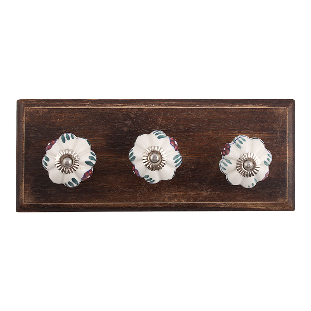 Erica Melanthera Ceramic Wooden Hook. A Perfect Complement to the Soft Tone of the Wood are these White Traditional Hat & Coat Hook Made of Genuine Porcelain and Brass. It can be use to Hang Jewellery, Leashes, Towels, Scarves, Light Weight Sweaters, Caps Etc.