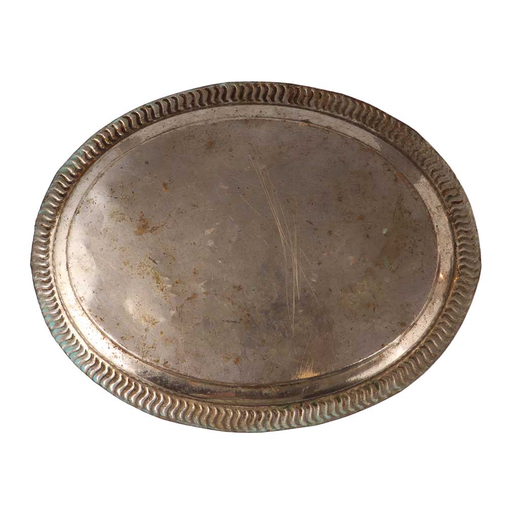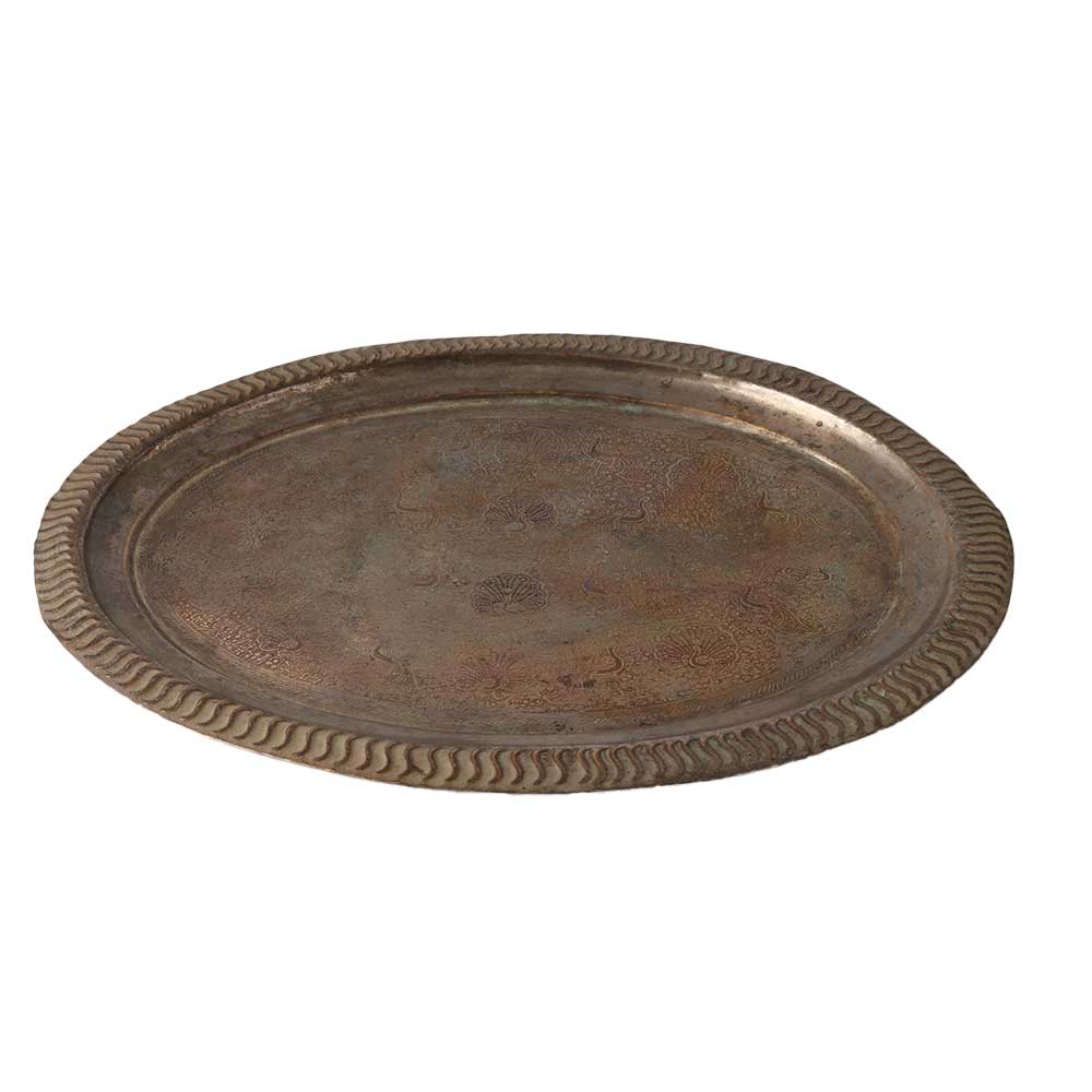 This is a pretty small scallop-edged vintage brass etched tray. The tray has a pretty scalloped edge, and in the middle is an etched pattern of flowers and people. The maker's mark is absent. Put it to use as decoration. It is in a good condition for its vintage age and is prepared for gift-giving.