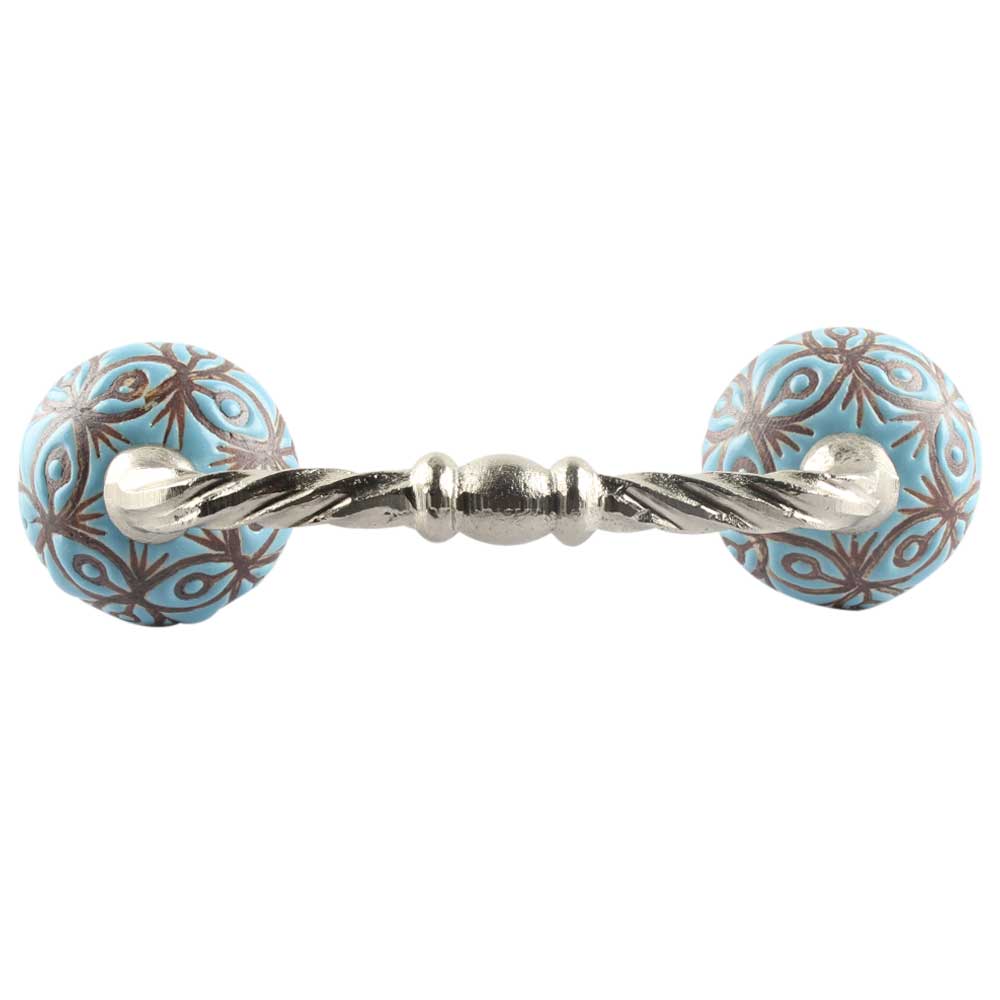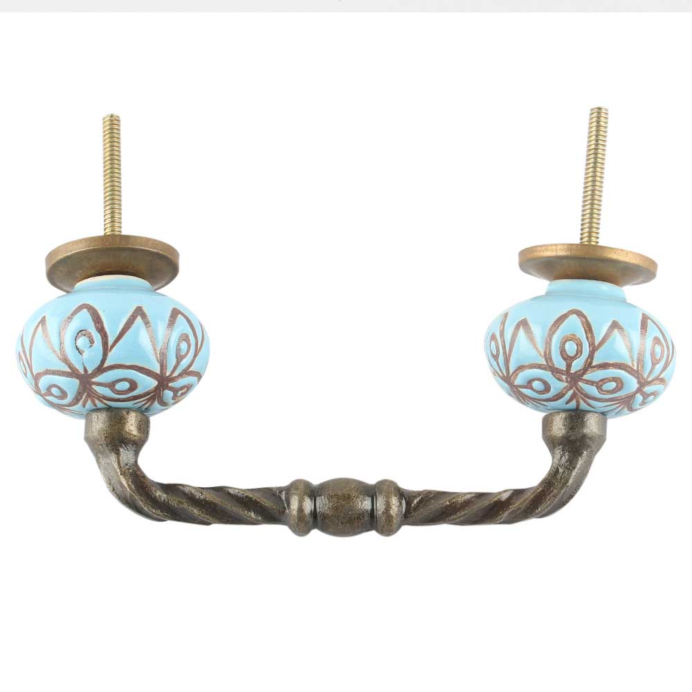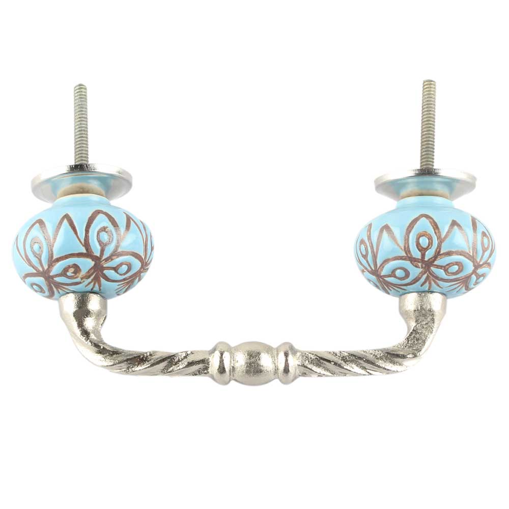 Etched Ceramic Cut Floral Bridge Handle in Turquoise. Ideal for Drawer, Dresser, Cabinet, Wardrobe, Cupboard and Almirah etc.