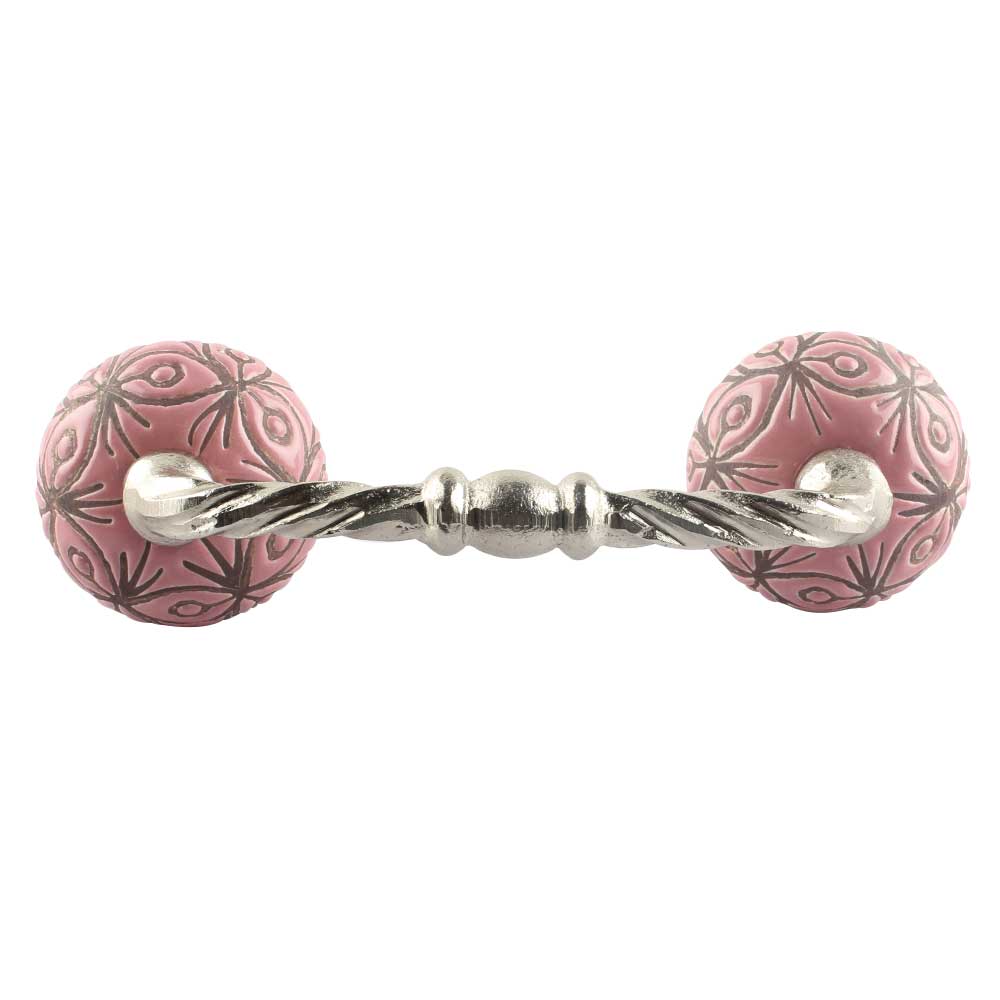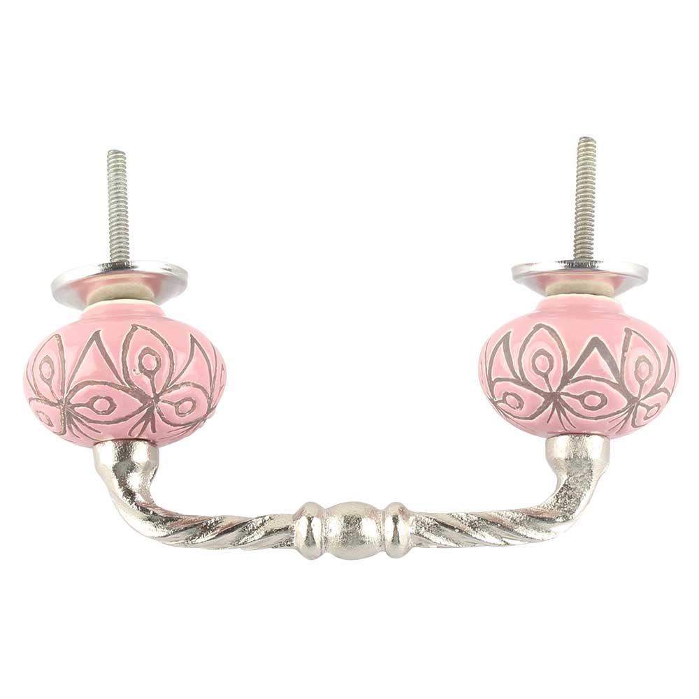 Etched Ceramic Floral Cut Bridge Handle in Pink. Ideal for Drawer, Dresser, Cabinet, Wardrobe, Cupboard and Almirah etc.
