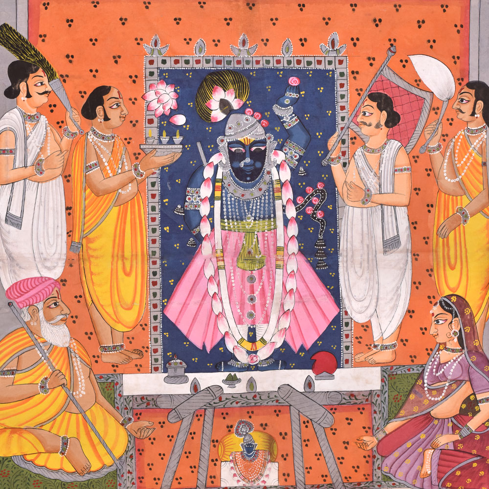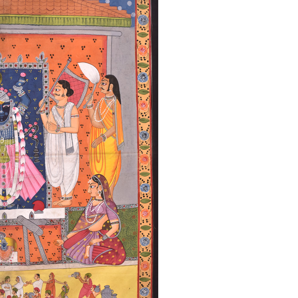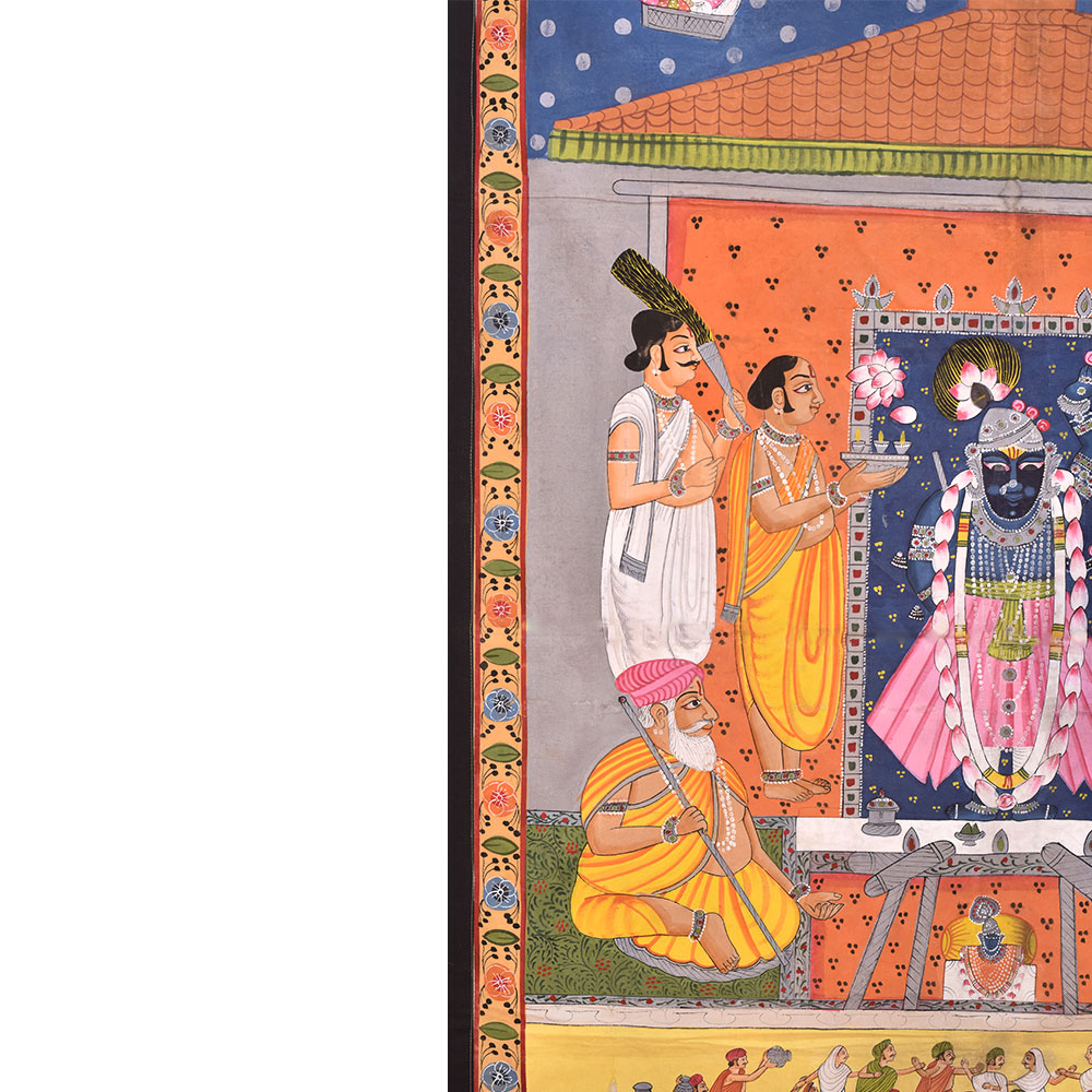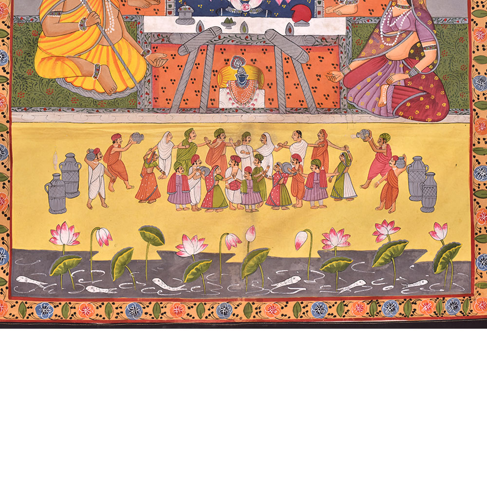 The pichwai painting on fabric cloth is an exquisite depiction of Hindu God, surrounded by saints and devotees, being worshipped at a temple. The intricate painting is a testament to the incredible skills of the professional Indian artists who have captured every detail of the scene with multi-coloured paints. The painting is bordered by beautiful floral designs in vibrant colours that add a sense of vibrancy and energy to the composition. The painting also features two swans, the vehicle of the Hindu God, flying in the sky with two passengers each, adding a touch of whimsy and mystical charm to the piece. This stunning work of art is a perfect addition to any prayer room or temple, creating an atmosphere of devotion and spirituality. It also makes for a truly auspicious gift for family, friends or relatives on special occasions, such as weddings, birthdays, or other festive celebrations. Overall, this pichwai painting is a visual feast for the eyes and a wonderful way to celebrate the divine in all its beauty and glory.