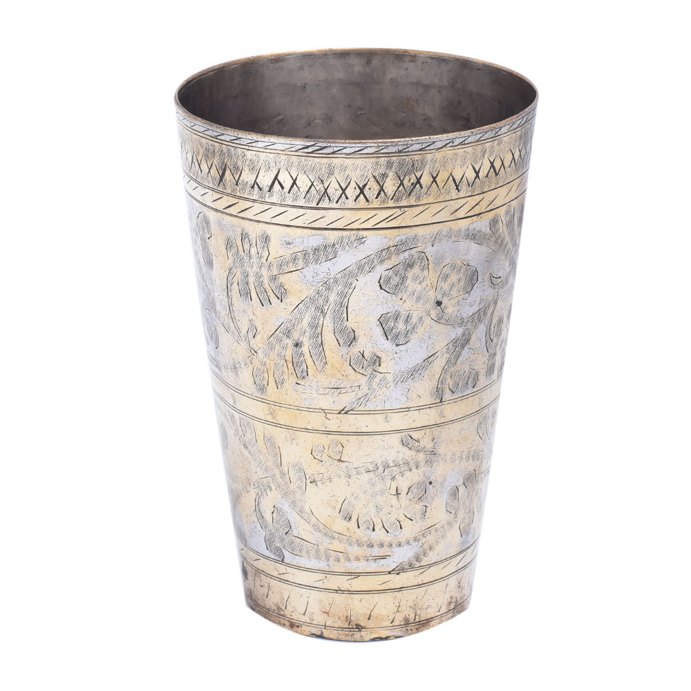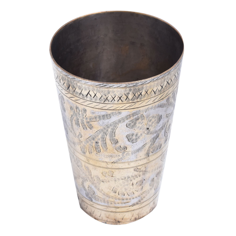 Brass north indian Lassi glass carved with leafy pattern in border and decorated With gold highlights. This traditional lassi glass is a strong, elegant, and lovely addition to any home. It is frequently quickly transformed into a lovely day of remembrance, Wedding, Diwali, or Valentine gift item.