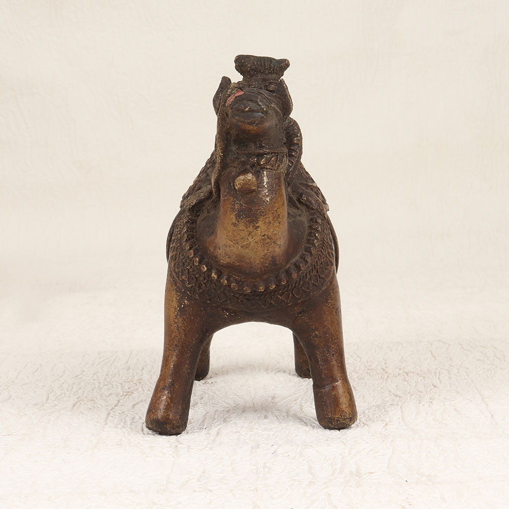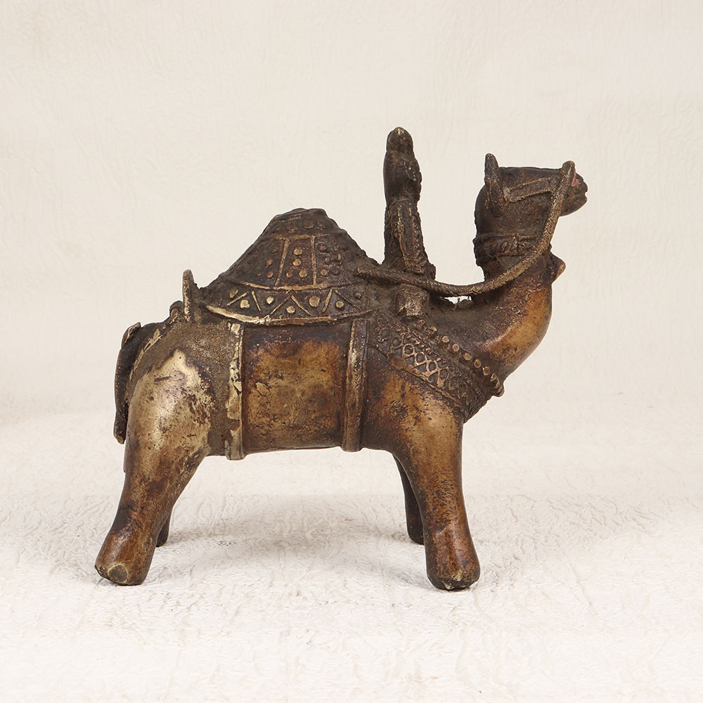 Transport yourself to the enchanting landscapes of Central India with this exquisite vintage brass camel with rider statue. Meticulously handcrafted by highly skilled and experienced Indian artisans, this masterpiece exudes timeless charm with its antique brown finish. Crafted from high-quality brass, the statue showcases the artisanal prowess of Central Indian craftsmanship. With its intricate detailing and nostalgic appeal, this camel and rider statue is a perfect addition to your home, office, restaurant, hotel, or cafe for a touch of cultural elegance. Its versatile design complements various settings, making it an ideal choice for decoration. Elevate your vintage collection with this unique piece that effortlessly blends tradition and artistry. Not just a decor item, this statue makes for a thoughtful and meaningful gift for your family, friends or relatives on special, festive, or auspicious occasions. Celebrate the richness of Indian heritage and add a touch of warmth to any space with this handmade vintage brass camel with rider statue from the heart of Central India.