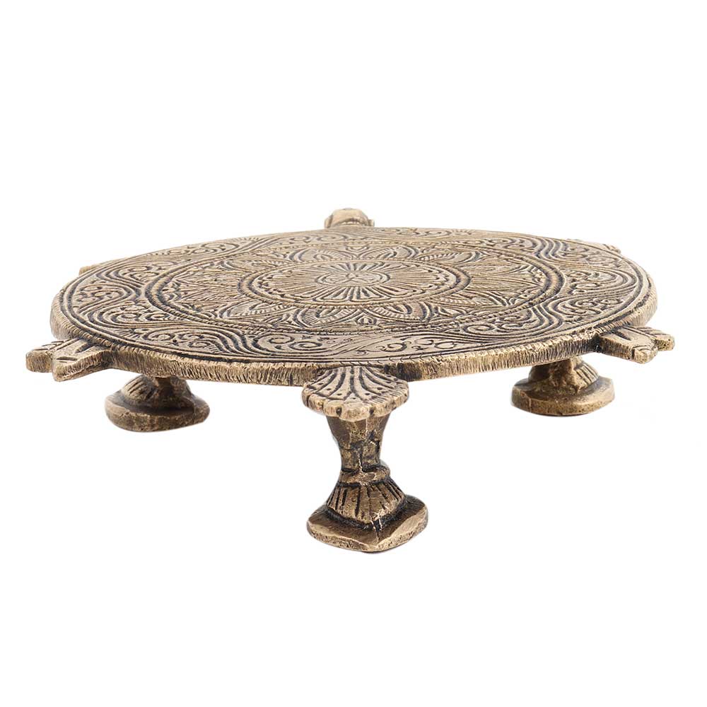 This brass is an example of fine craftsmanship made in superior quality brass metal table with some lovely floral carving on top and many legs. Religious gift , feng shui gift, Christmas gift , house warming gift, used in pooja ghar, in religious places or in your home interiors.