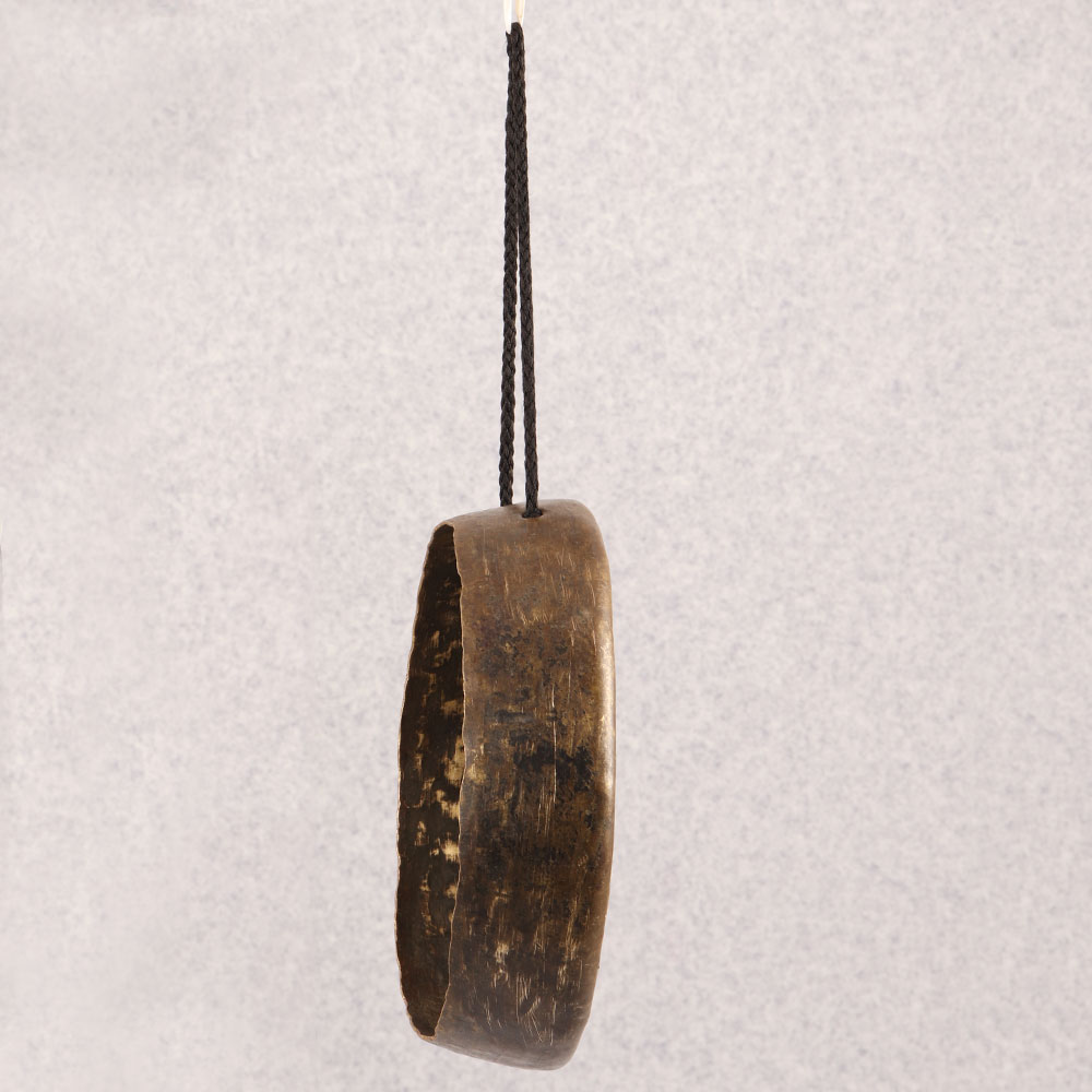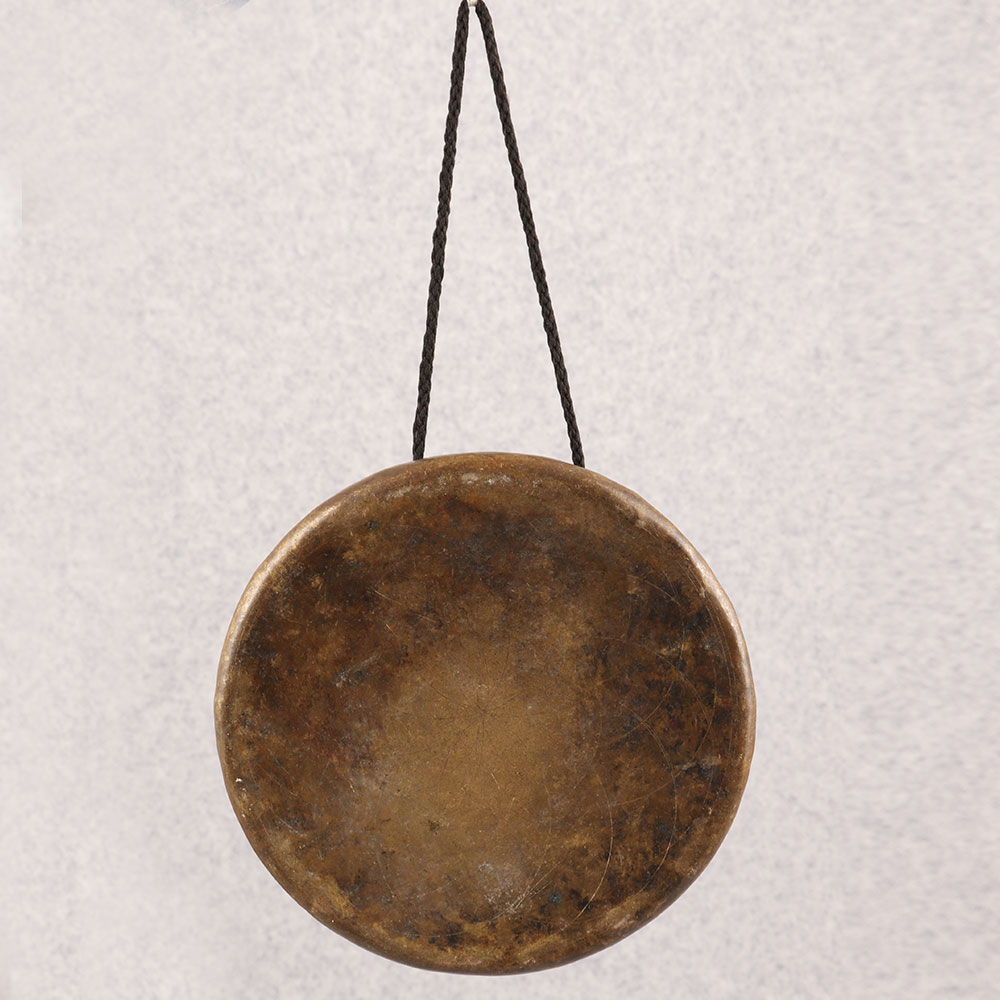 Decorate your home with the timeless charm of our Vintage Bell Metal Gong that is a masterpiece meticulously crafted by professional artisans in the revered Tibetan art tradition. This exquisite piece boasts a warm antique brown finish, adding a touch of rustic elegance to any setting. Made from high-quality bell metal, the gong resonates with a rich, melodious tone that transports you to a bygone era. Featuring a convenient string for hanging, this gong can effortlessly grace your home, office, restaurant, hotel, or cafe, infusing a sense of serenity and cultural richness. Its versatility extends beyond mere decoration, as the soothing chimes serve to create a tranquil atmosphere, making it ideal for meditation or relaxation practices. This handmade gong is a testament to the craftsmanship of Tibetan artisans and makes for a remarkable addition to any vintage collection. Embrace the spirit of gifting by presenting this bell metal gong to your family, friends or relatives on special, festive, or auspicious occasions. Whether adorning your personal space or becoming a cherished gift, this Vintage Bell Metal Gong is a celebration of artistry and heritage.
