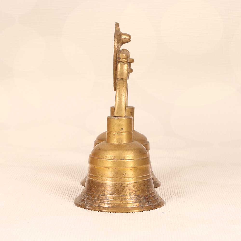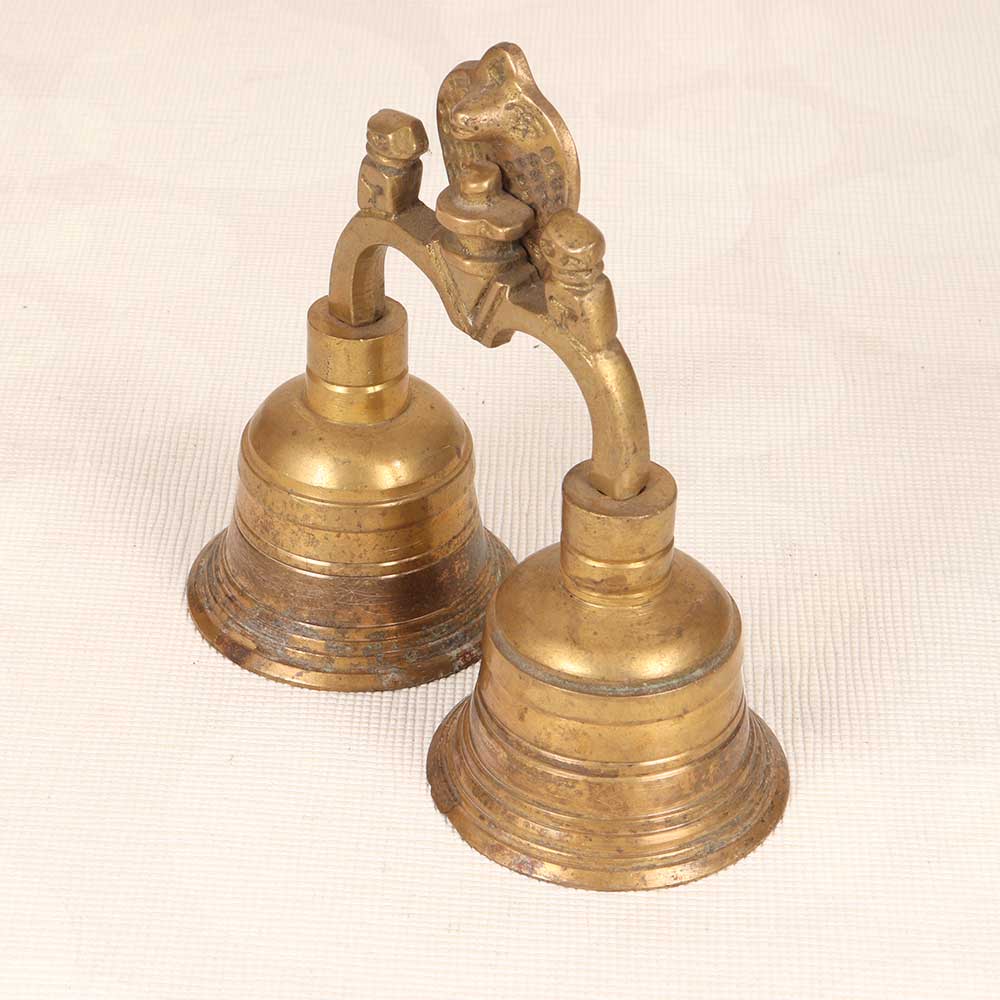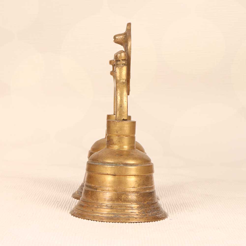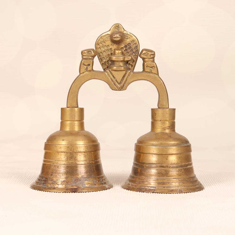 Embrace tradition and connect to the divine with this exquisite vintage Indian temple bell. Cast in polished brass, this bell depicts Lord Shiva, the great yogi, seated in meditation with a cobra above, representing wisdom and renewal. Let its resonant tone purify your space as you call the faithful to worship or sit in contemplation. Feel its vibration wash over you, quieting your mind and uplifting your spirit. Handcrafted with fine detail, this sacred instrument brings beauty and meaning to your daily practice. Ring it mindfully to center yourself and amplify your intentions. Display it proudly to honor your faith. This bell's stunning craftsmanship and rich tone will enhance any spiritual ritual.